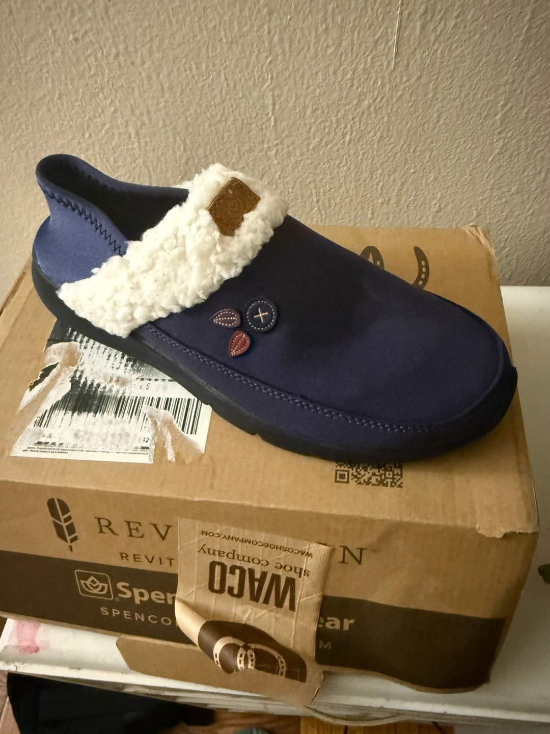 Selling a pair of Spenco Women's Revive Slippers in Peacoat color, size 8. These slippers come with the original box. They feature a comfortable design and are perfect for indoor wear!