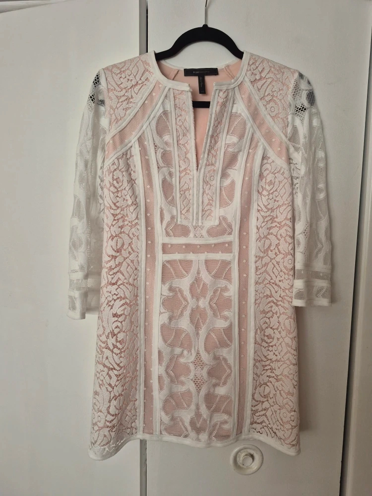 Selling a BCBGMAXAZRIA dress in size small. It features a beautiful lace design and a flattering silhouette. Perfect for a special occasion or a night out!