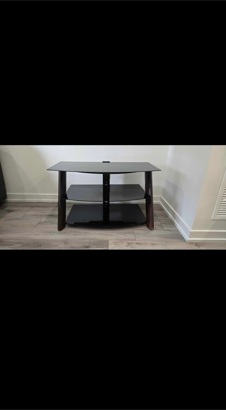 Selling a TV stand with a sleek glass top and wood accents. It features multiple shelves for your media devices and accessories. Great for organizing your entertainment setup!