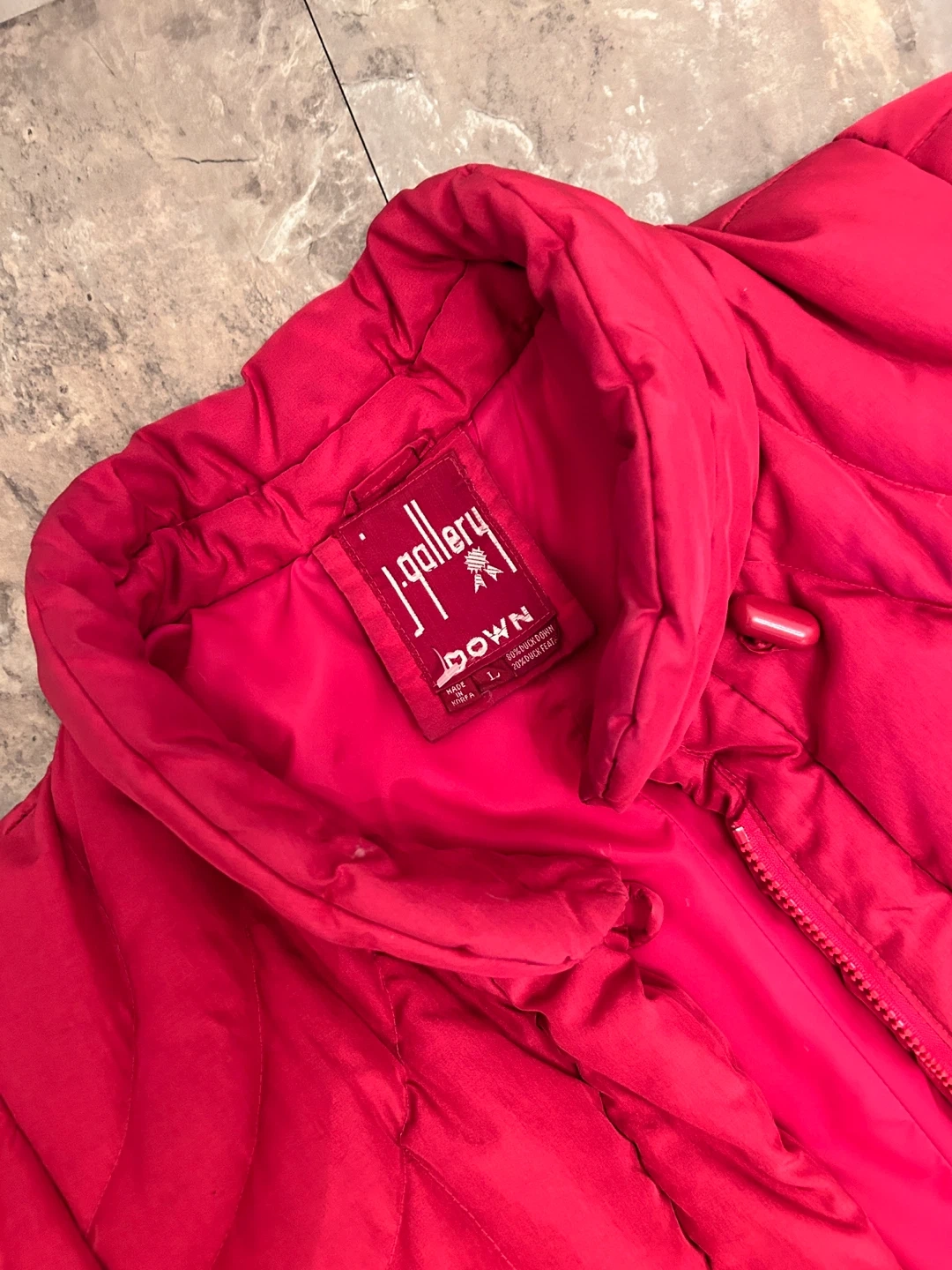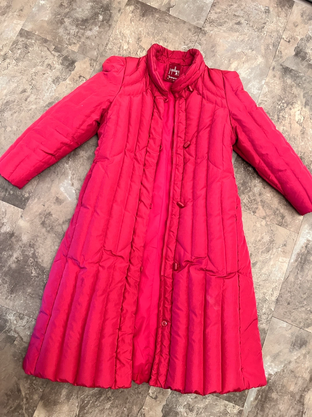Lovely red puffer down filled long coat, perfect for keeping warm during the colder months! It has a button-up, zippered front and a unique design. Great for adding a pop of colour to your winter wardrobe