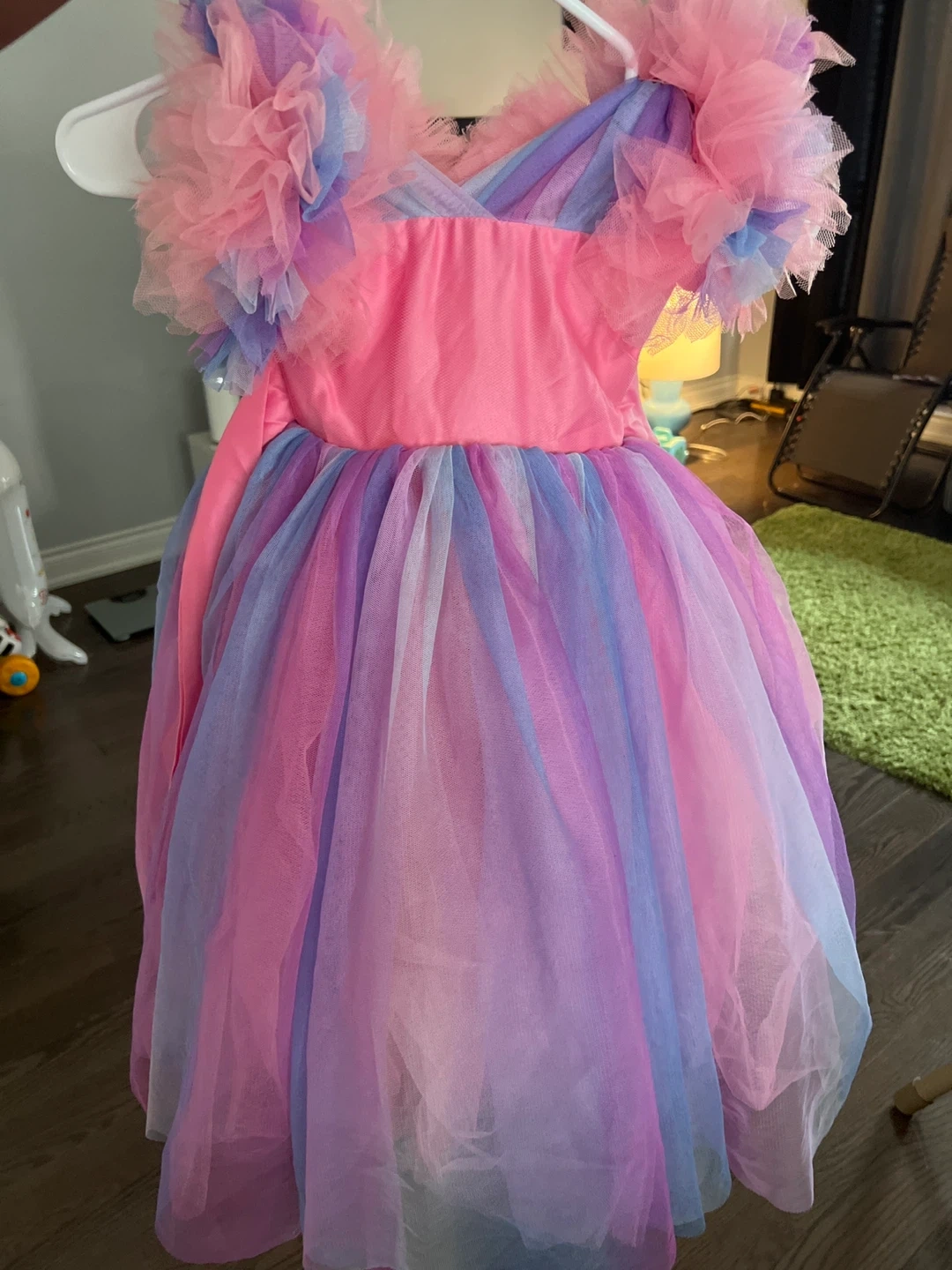 Beautiful dress with a pink bodice and flowing pastel tulle skirt. The dress has a unique design with ruffled accents on the shoulders. It's in great condition and ready for a special occasion! Age 1-3