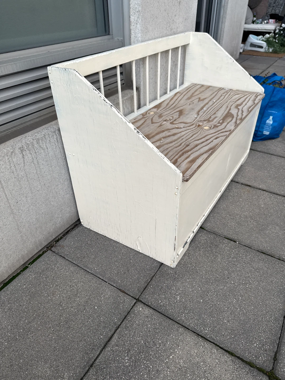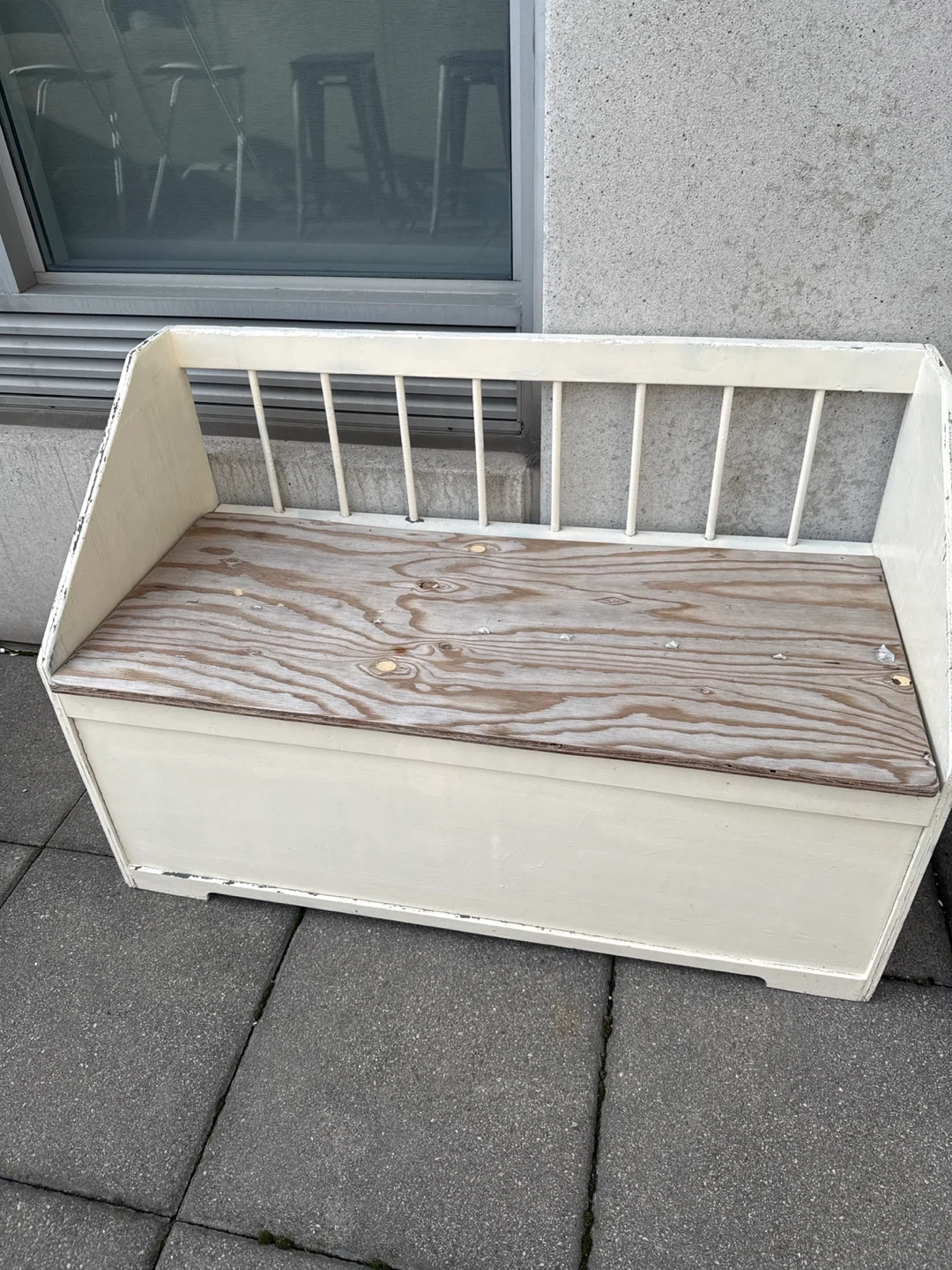 I have a wooden bench with storage available. It's perfect for adding extra seating and storage to your entryway or mudroom. The bench is painted in a neutral colour and has a lift-up seat for easy access to the storage compartment. It is in good condition.