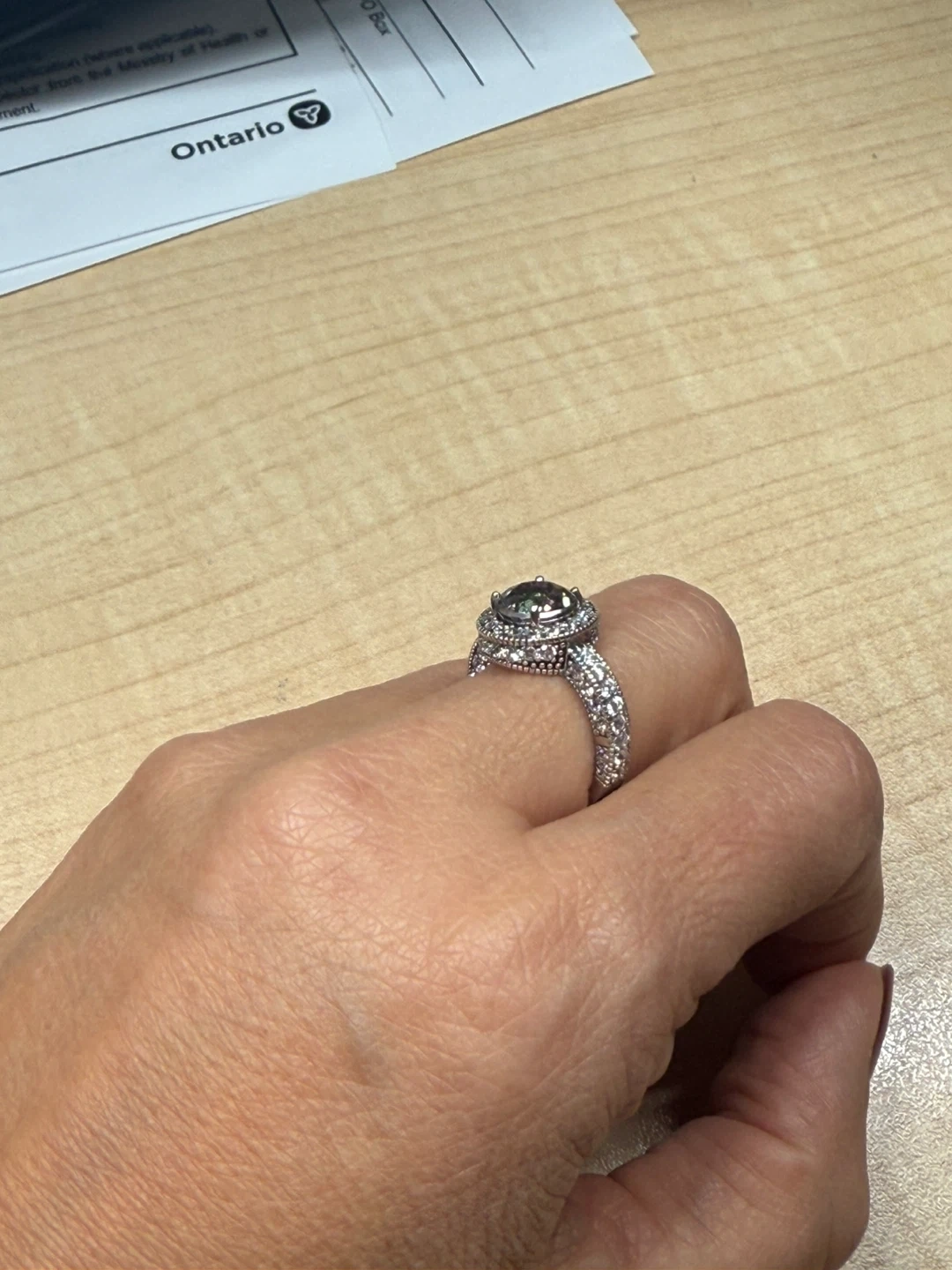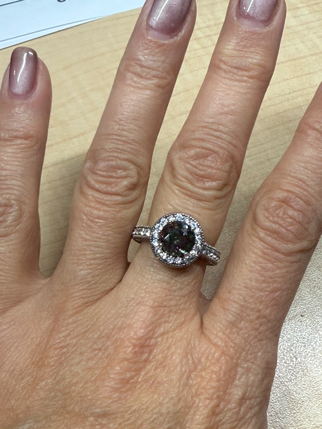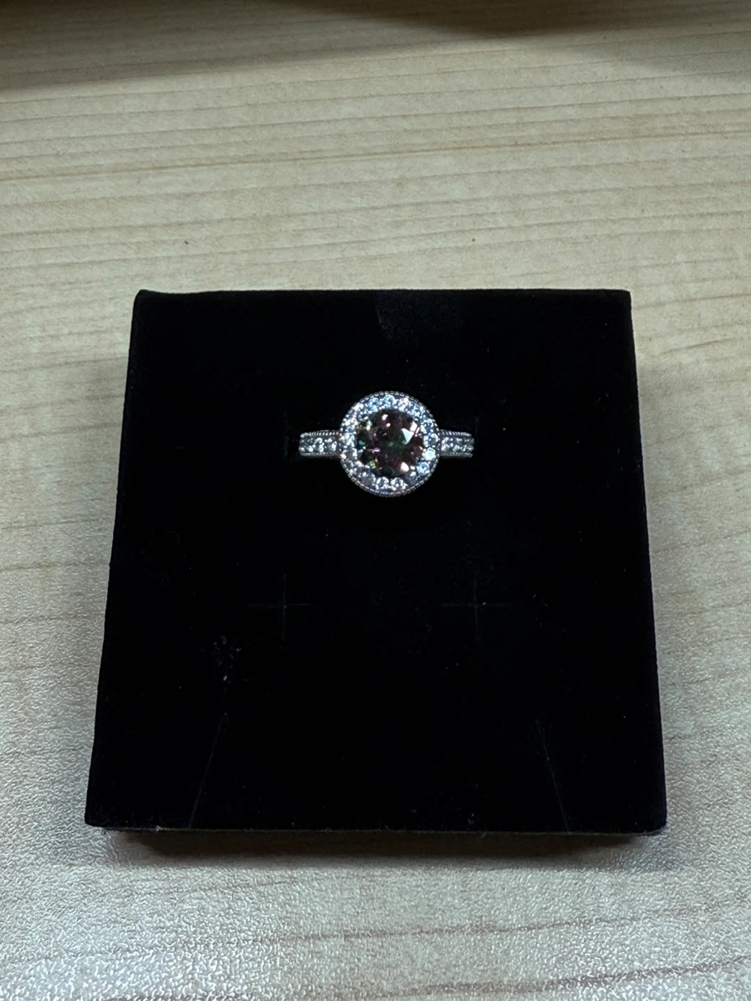 Selling a lovely 925 sterling silver halo ring featuring a large mystic topaz and white crystals. It comes with a royal blue dust bad…perfect for gifting or safekeeping! It is in excellent condition.