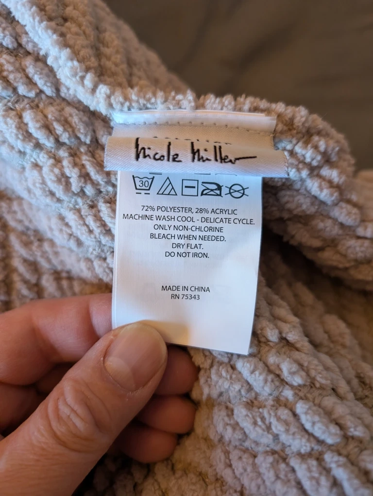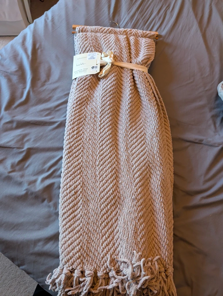 Snuggle up with this cozy Nicole Miller Artelier decorative throw! It's a lovely beige colour and measures 50" x 70" (127cm x 178cm). Made of 72% polyester and 28% acrylic. Originally bought for $34.99 at Homesense.
