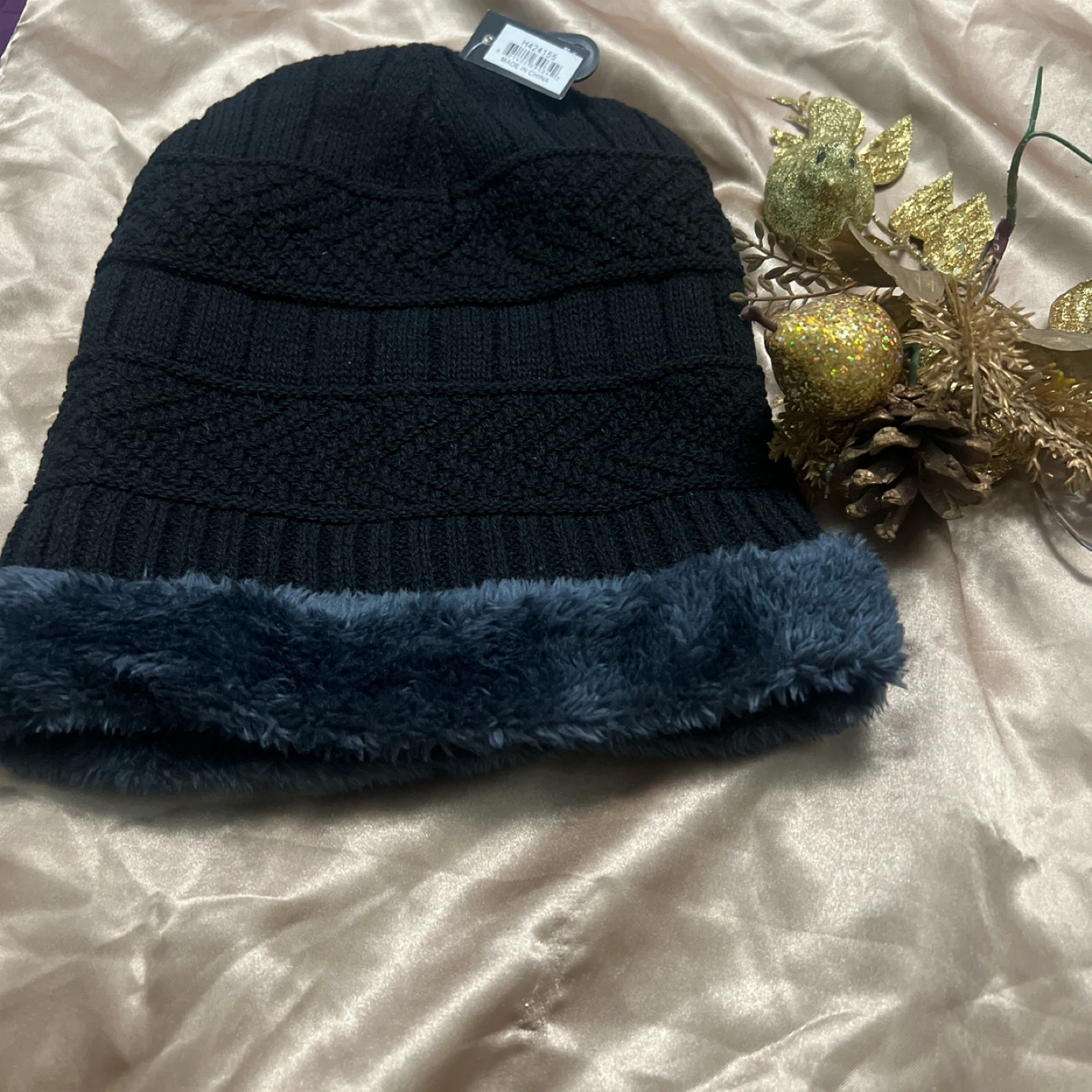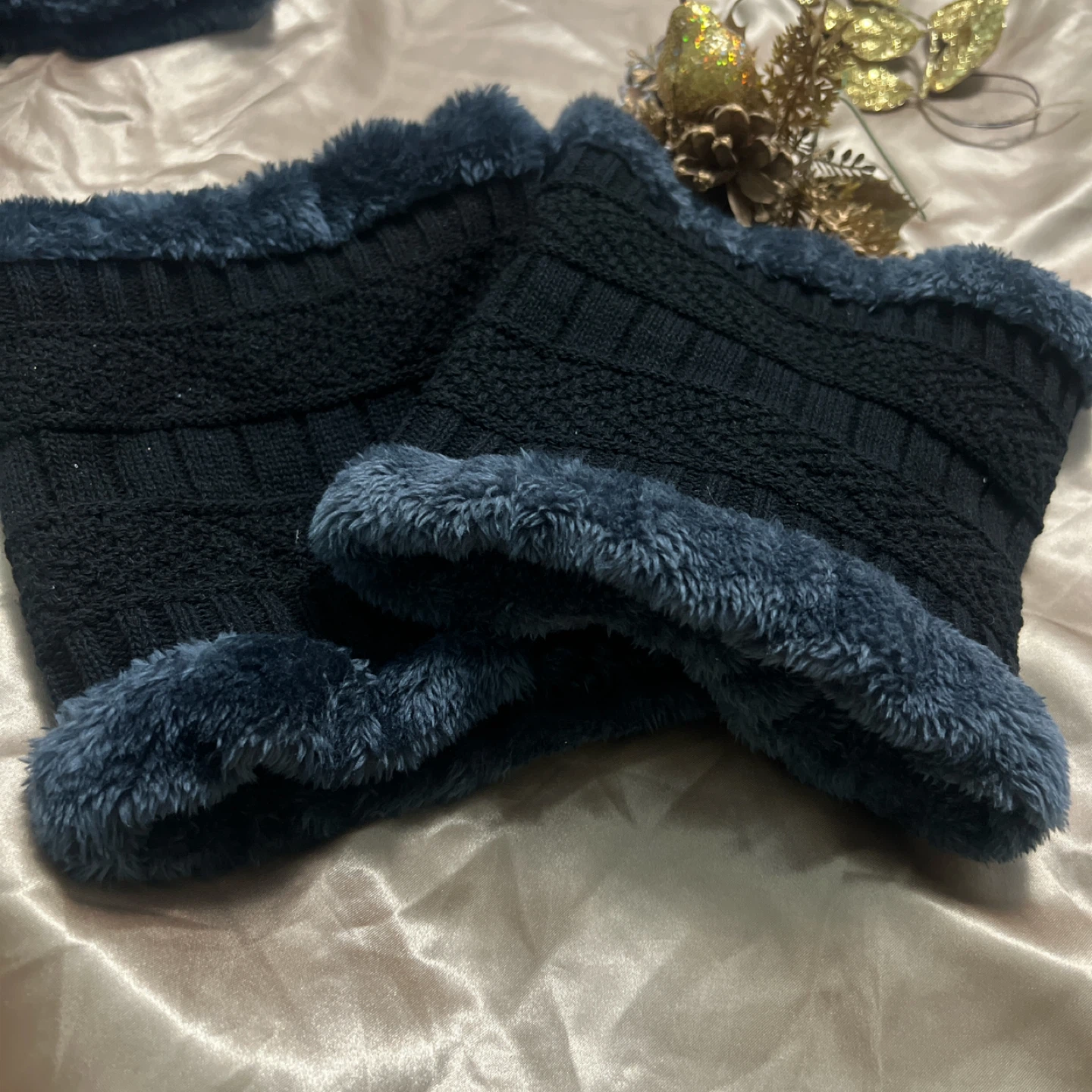 Cozy up with this black knit hat and neck warmer set! Perfect for staying warm during the colder months. The set includes a hat and a neck warmer, both made of a soft knit material with a furry trim. Each item is 6$ or all 3 for $14.