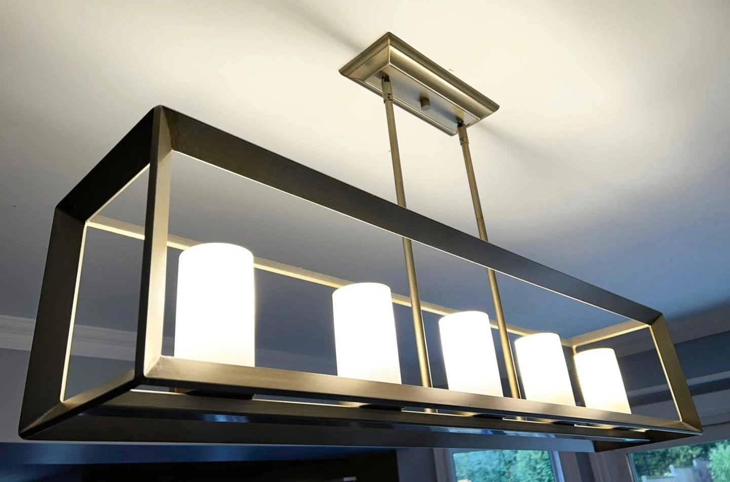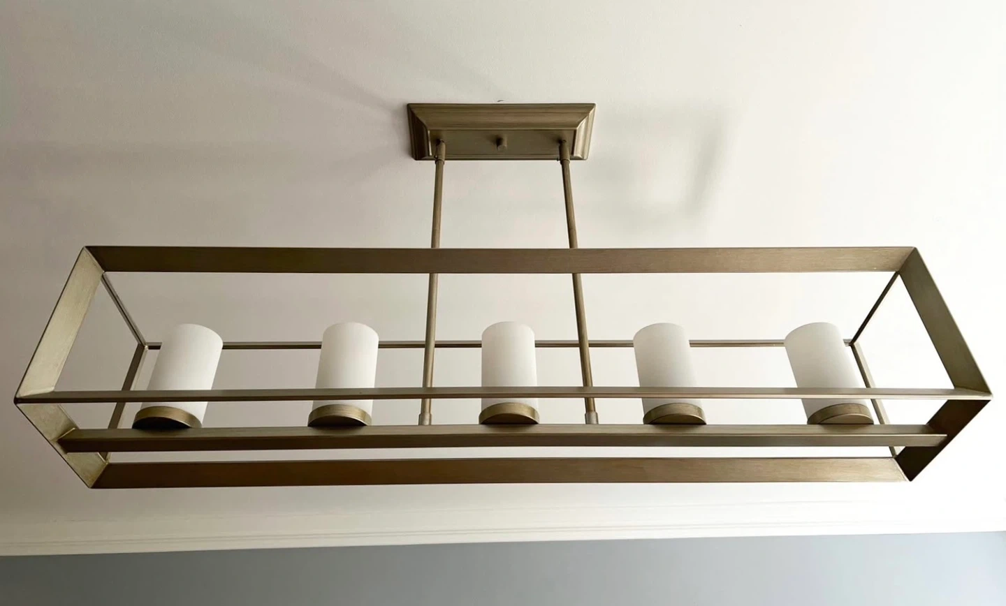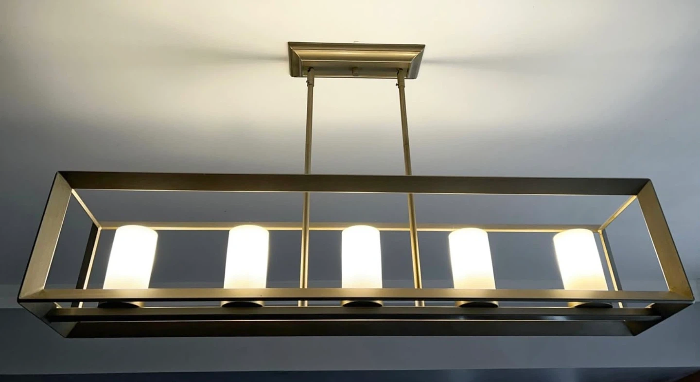 Here's a stylish rectangular pendant light fixture that would look great over a dining table or kitchen island! It features a metal frame and five cylindrical lights. It's in excellent condition and ready to brighten up your space