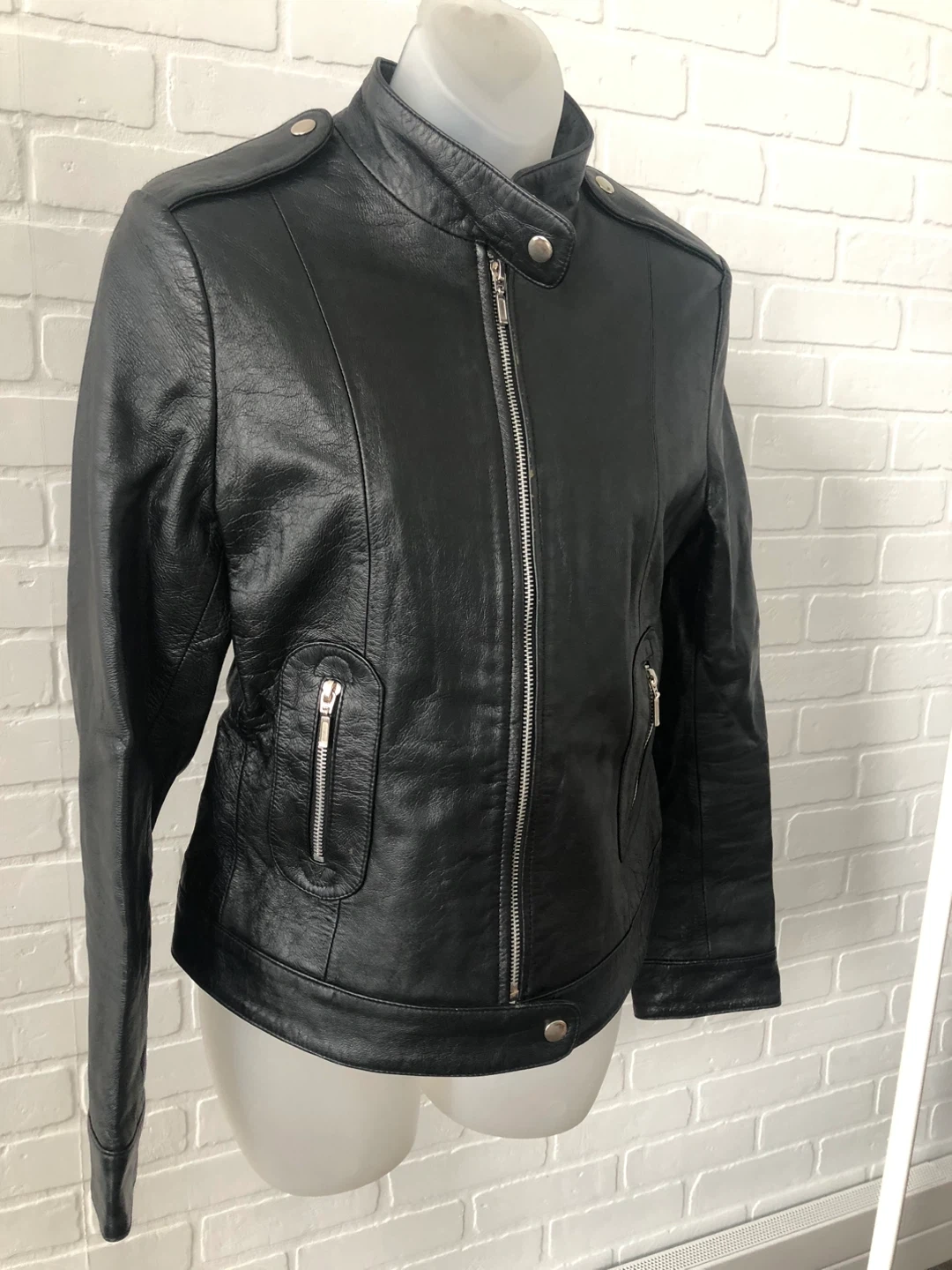 Selling a stylish black leather jacket! It's made with 100% leather and has a 100% satin lining. It's in great condition.