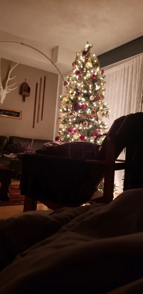 Stunning pre-lit Christas tree + gold & burgundy ornaments