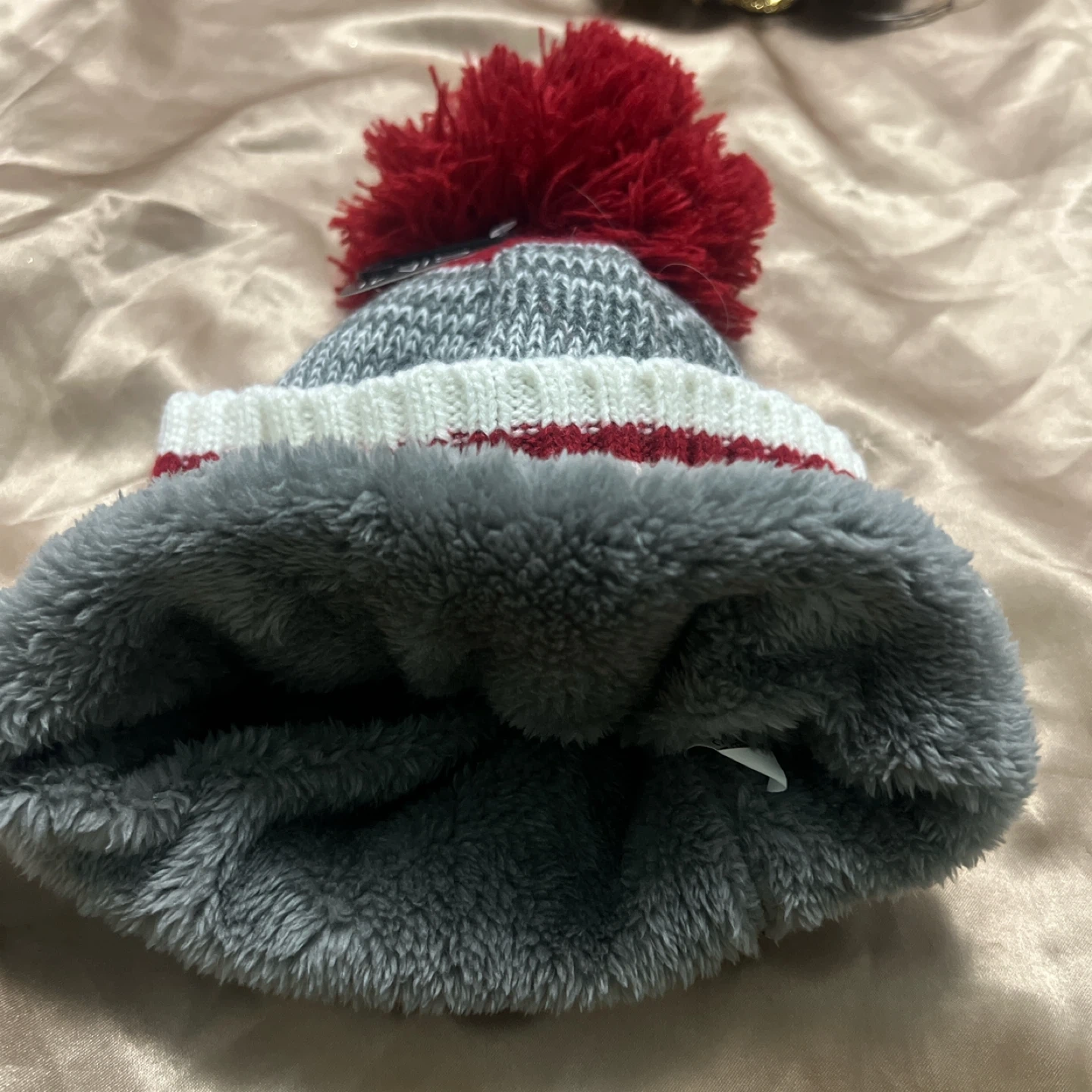 Keep warm this winter with this cozy striped beanie! It features a red pom pom on top and has a grey, white, and red striped pattern. The inside is lined with a soft, grey plush material for extra warmth and comfort