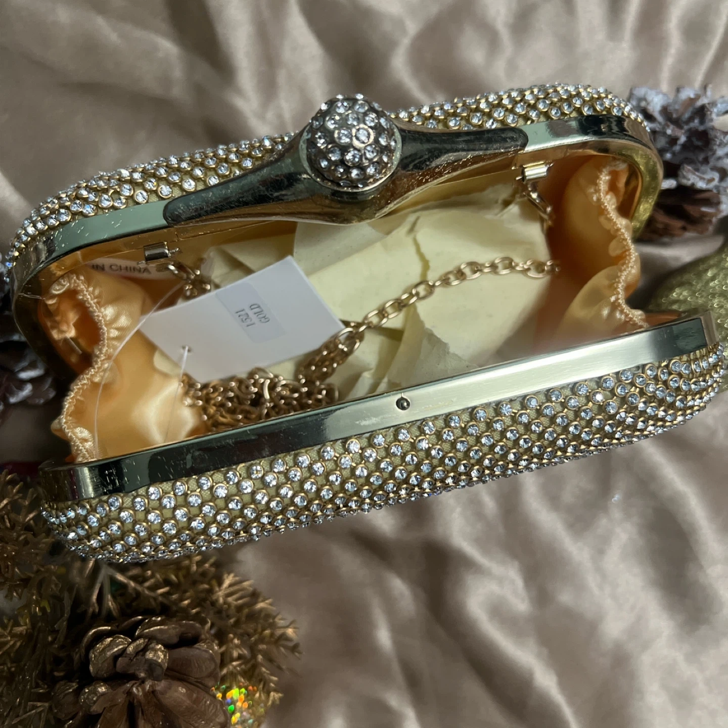 This gorgeous gold clutch is covered in sparkling rhinestones, making it perfect for a special occasion or a night out. It comes with a chain strap, so you can carry it as a shoulder bag or tuck the chain inside and use it as a clutch. It's brand new and ready to add some sparkle to your wardrobe!