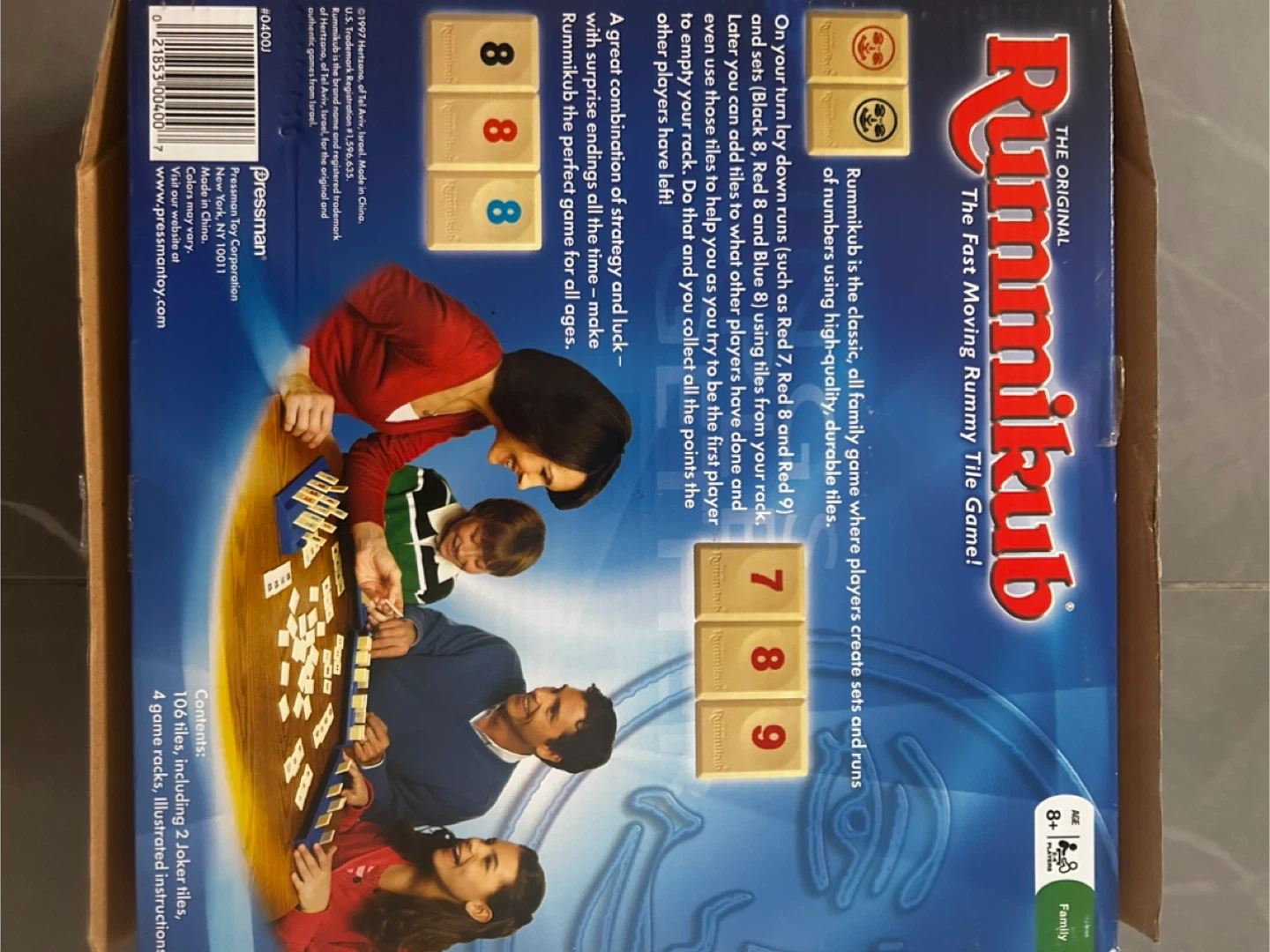 Selling the classic Rummikub game! It's a great family game for ages 8 and up, perfect for 2 to 4 players. The game includes 106 tiles, including 2 Joker tiles, 4 game racks, and illustrated instructions. Get ready for some fast-moving fun!