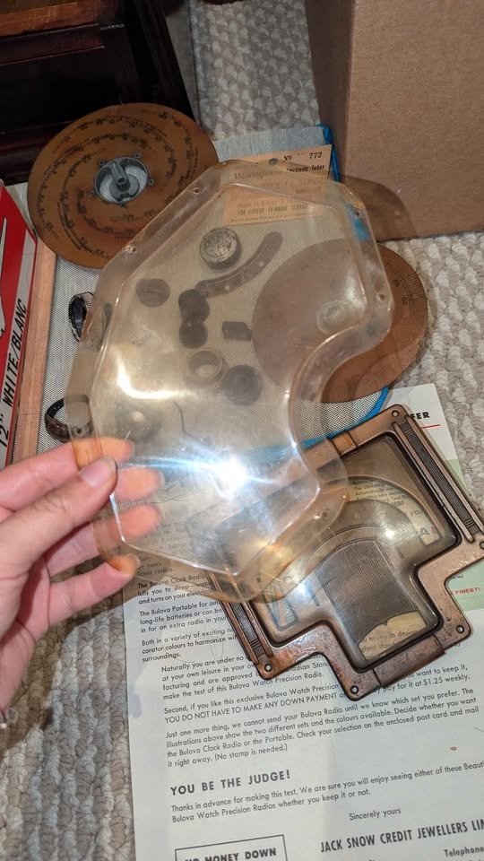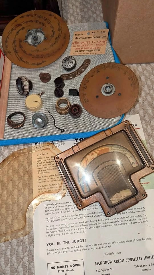 Vintage mixed lot of mid-century radio components and paperwork — a great find for collectors, restorers, or vintage décor enthusiasts. Includes:
