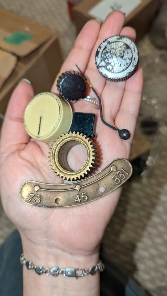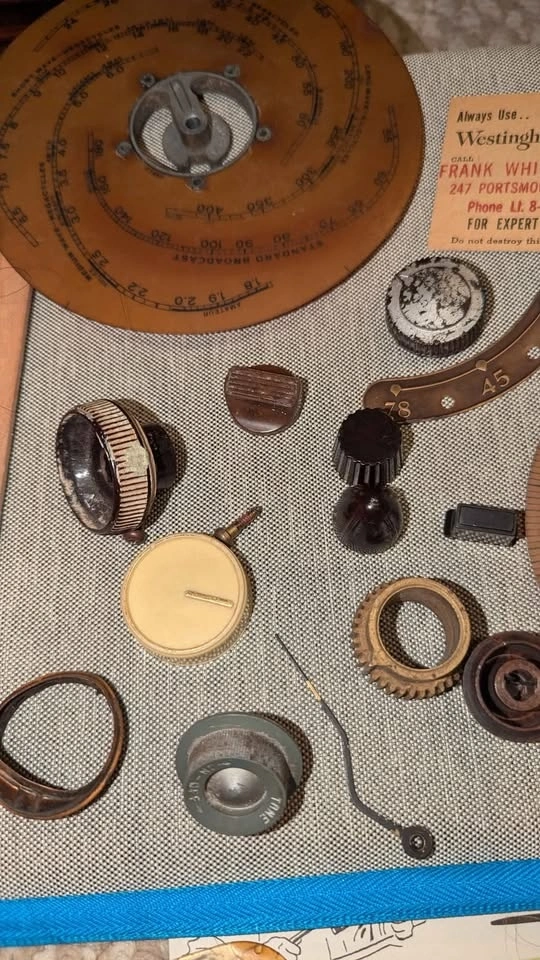Assorted radio knobs, tuning gears, spacers, and pointer needle