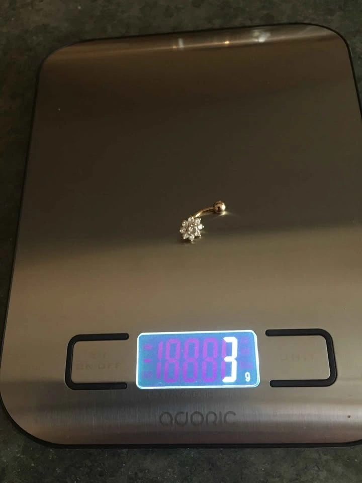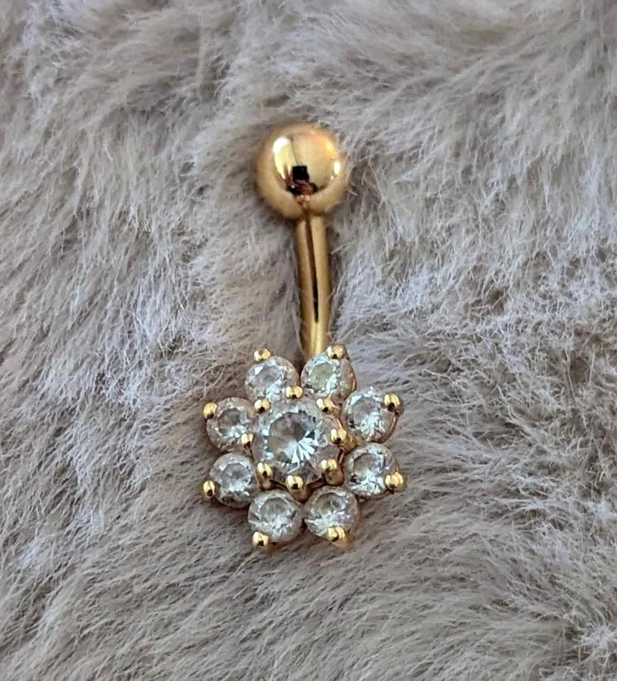 Like new, navel ring. Curved barbell solid 14k Gold with gemstones (not diamonds). 14 guage barbell. Approx 2 grams.