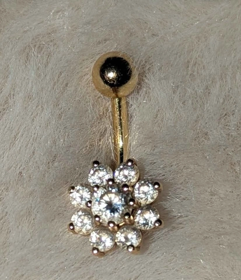 Like new, navel ring. Curved barbell solid 14k Gold with gemstones (not diamonds). 14 guage barbell. Approx 2 grams.