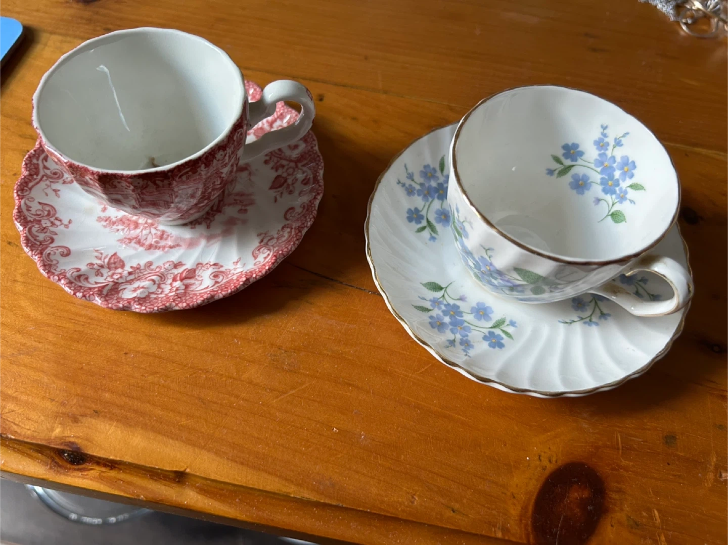 Two lovely vintage tea cups with matching saucers. One features a charming red toile pattern, and the other has delicate blue forget-me-nots. Perfect for adding a touch of elegance to your tea time!