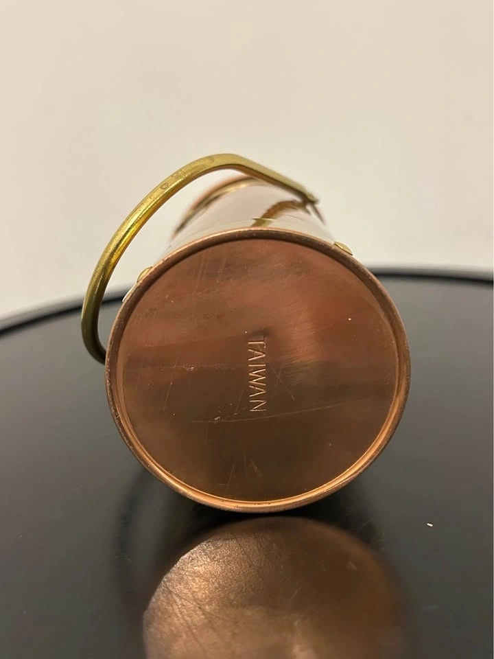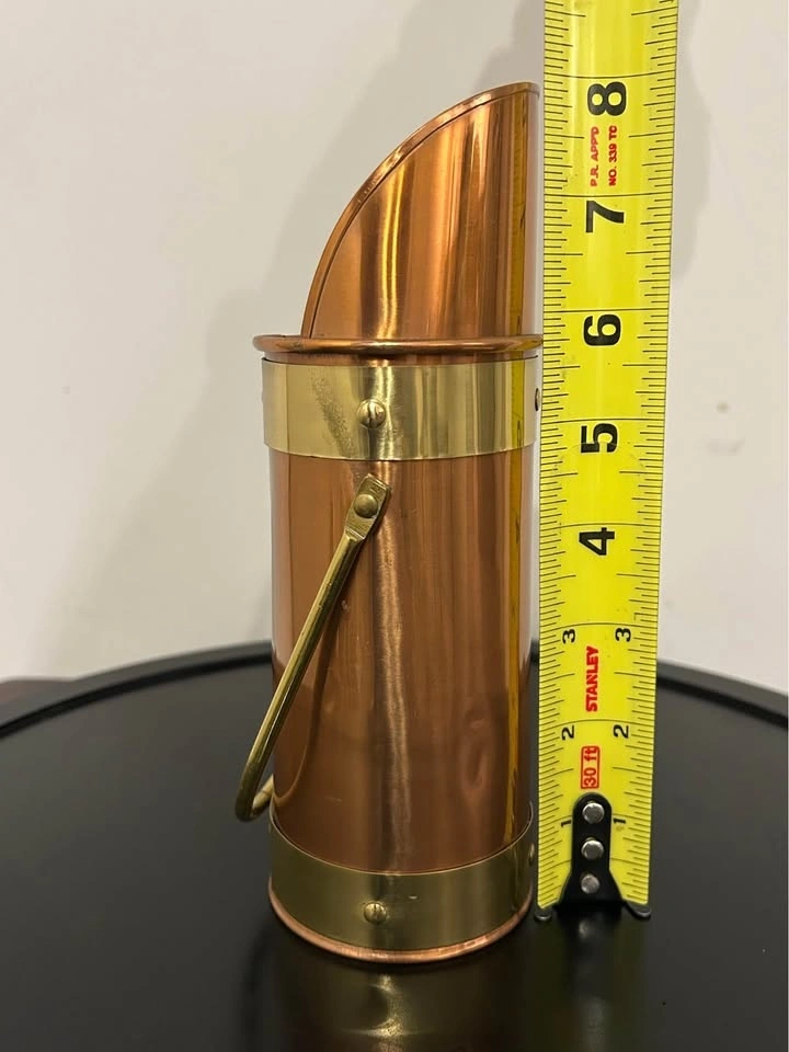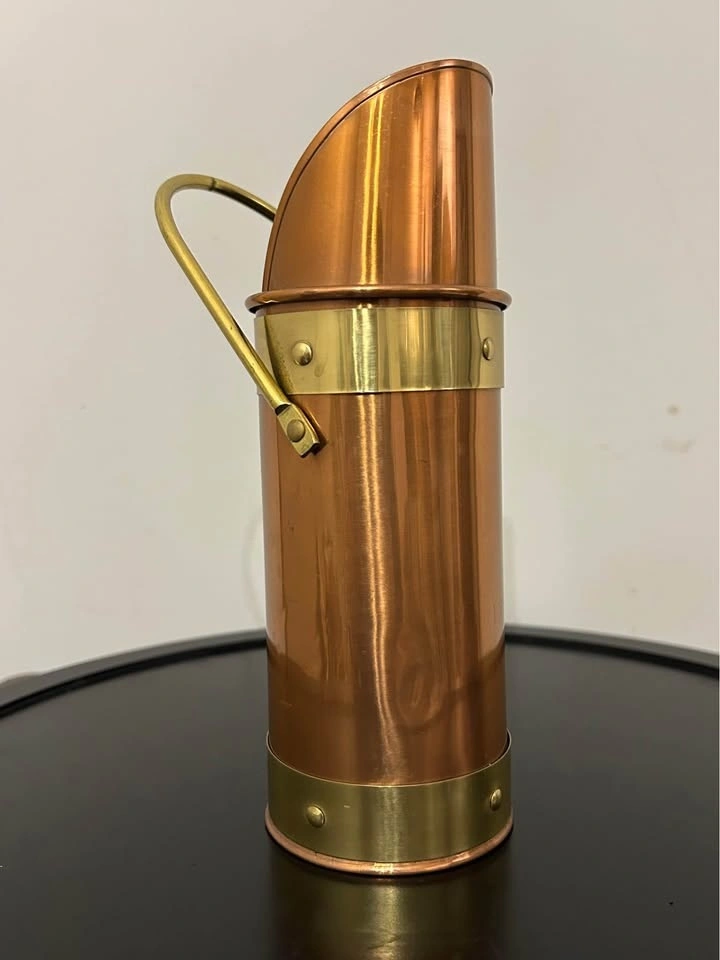 Elegant vintage copper & brass match holder, a beautiful accent piece for any refined fireplace setup. Warm polished copper combined with solid brass details gives it a timeless, high-end look. The angled top, brass handle, and front viewing window reflect classic 1970s–1980s craftsmanship. Marked Taiwan on the base.
