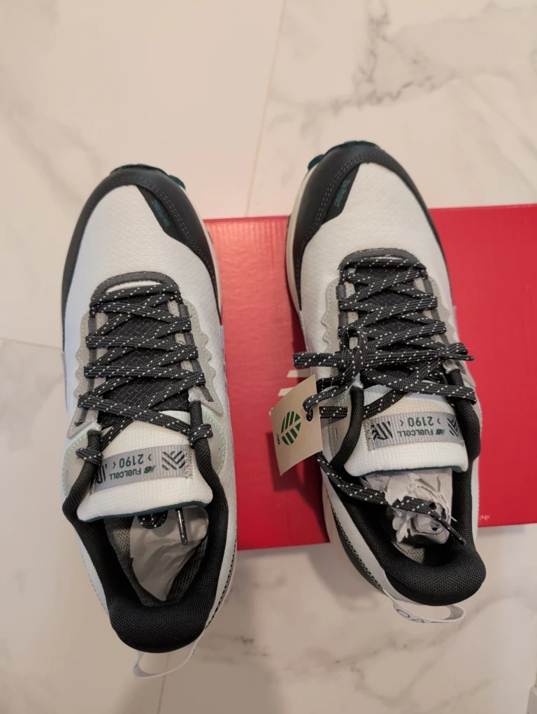 Selling a pair of New Balance FuelCell 2190 trail running shoes in size 9.5 (US Women's). They are white and grey, perfect for hitting the trails! They are brand new and come with the original box