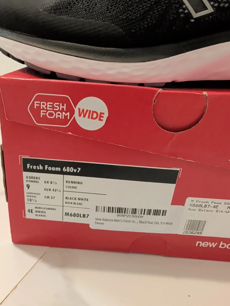 Selling a pair of New Balance Fresh Foam 680v7 running shoes in black. They are US men's size 9 and have a wide fit (4E). New.