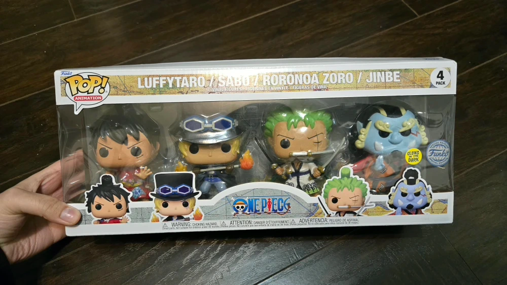 Selling a Funko POP! Animation One Piece 4-pack. The box includes Luffy Taro, Sabo, Roronoa Zoro, and Jinbe figures. Collect them all!