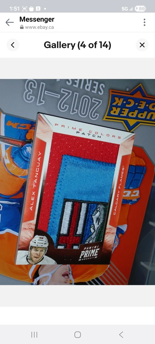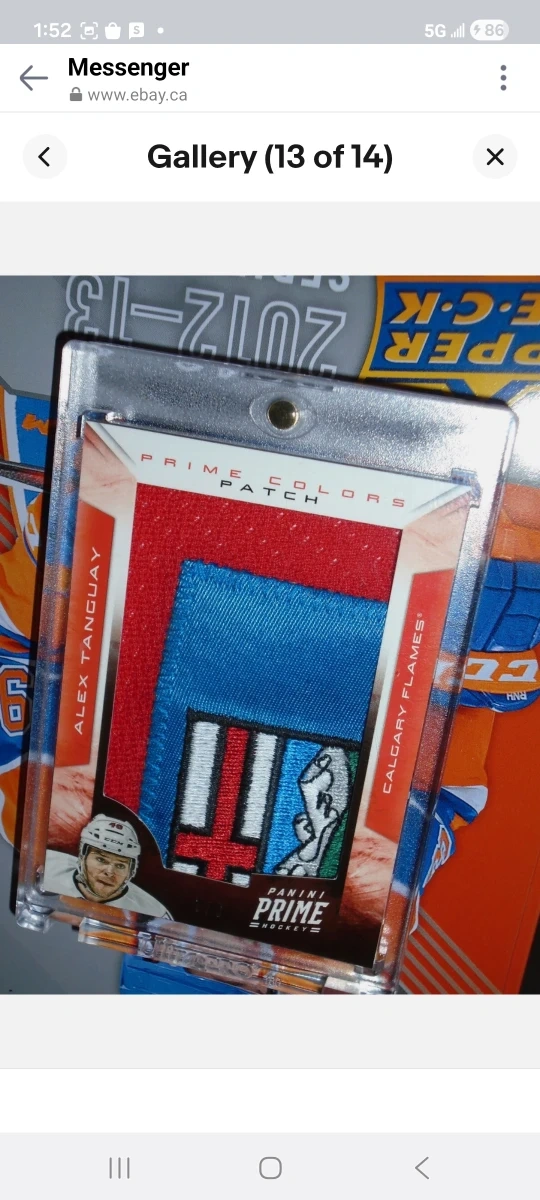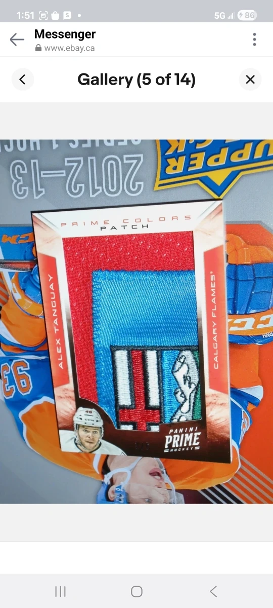 Selling an Alex Tanguay Panini Prime Hockey card! It's from the 2012-13 series. A great addition to any hockey card collection. Calgary Alberta patch stunning Vivid! Remember all cards and items can be shipped Canada wide for an extra $10 with tracking. I Paypal invoice will be sent for our assurance and security of purchase and sale. You may also use interact at your convenience and confidence.