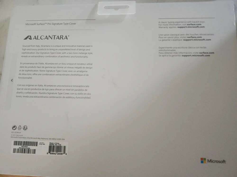I'm selling a brand new Microsoft Surface Pro Alcantara Signature Type Cover! It's still in its original packaging. This cover is made from Alcantara material, which is sourced from Italy and provides a unique and innovative feel. It combines high-end luxury with functionality. Get a classic typing experience with backlit keys. The box is included