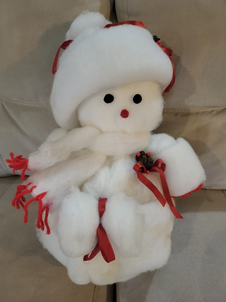 Here's a cute snowman plushie! It's white with a red ribbon accent. Perfect for adding a touch of winter charm to your home
