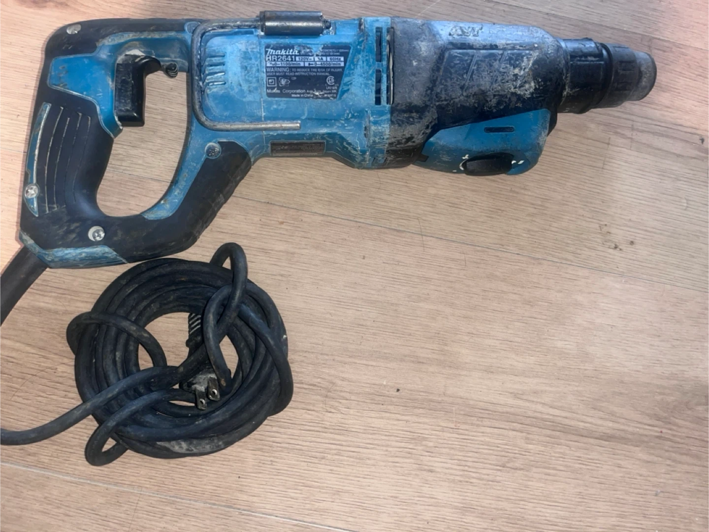 Selling a used Makita HR2641 rotary hammer drill. It shows signs of use, as seen in the photos, but it's still in working condition. Great for drilling into tough materials!