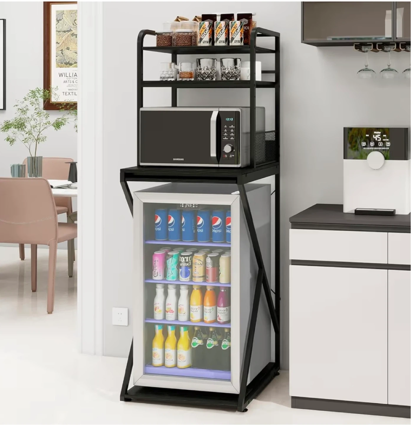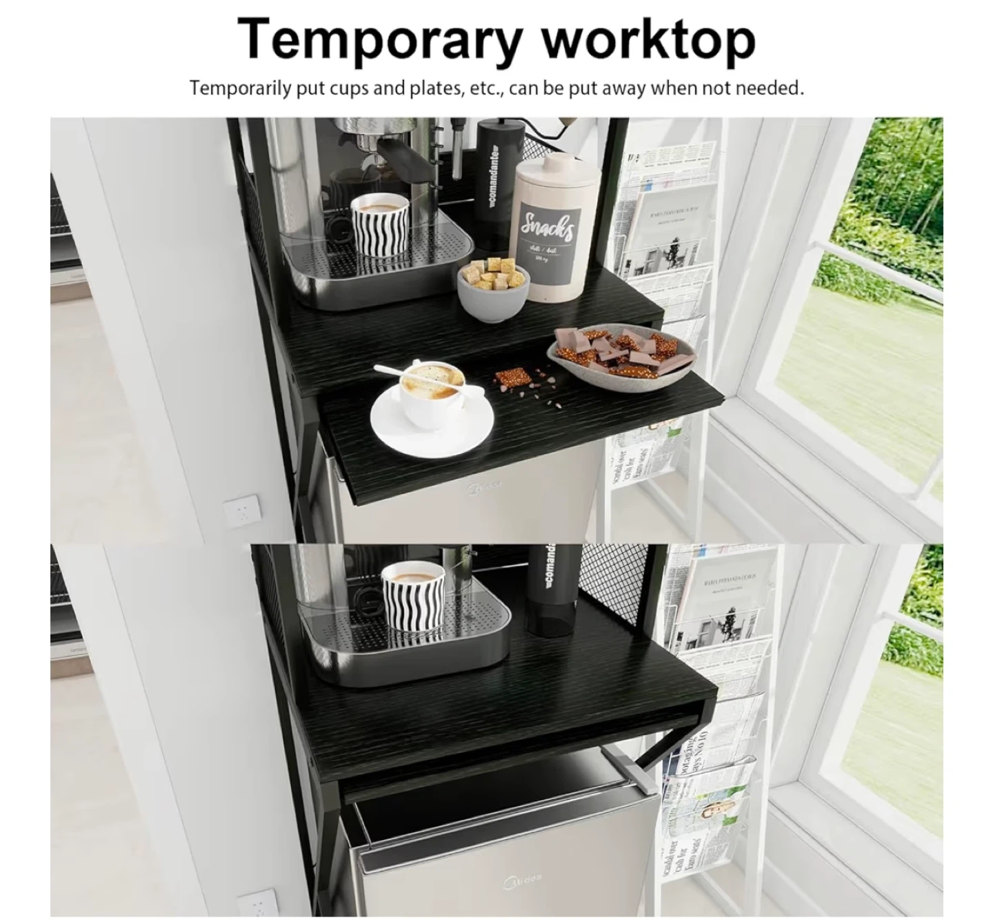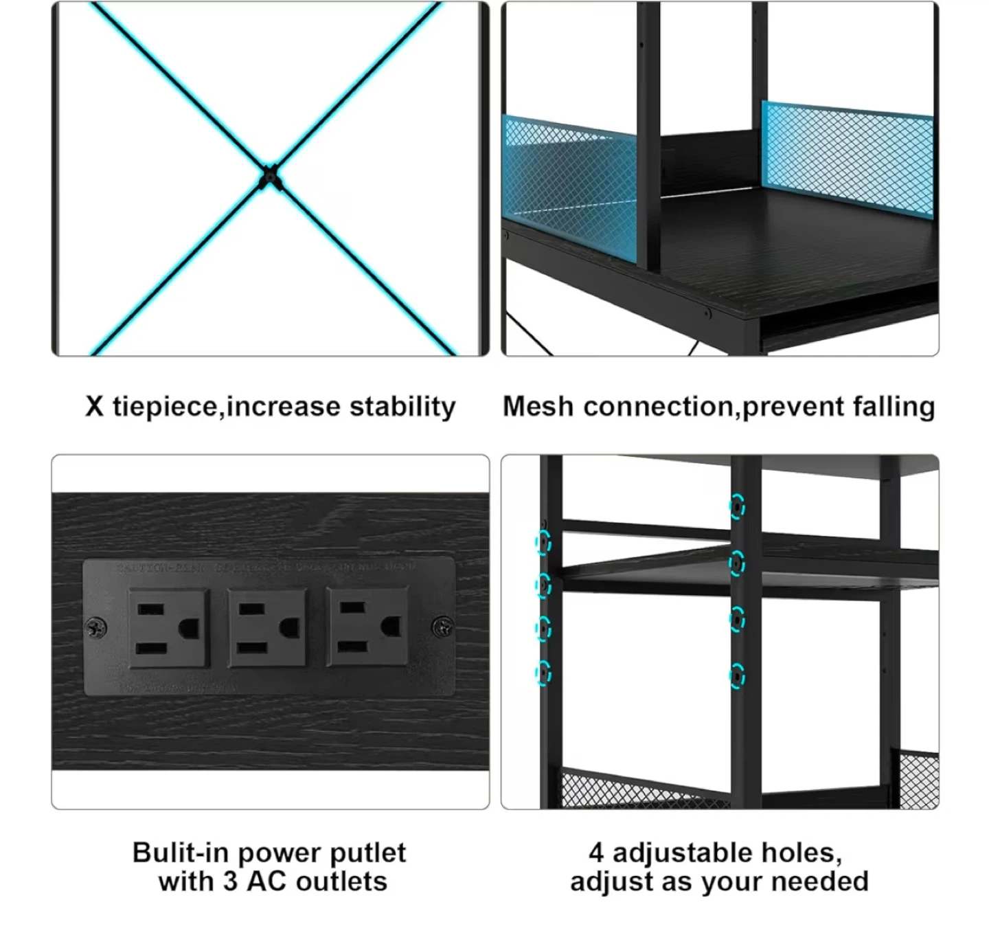 This baker's rack is perfect for your kitchen needs! It features a temporary worktop and adjustable shelves. The rack also includes a built-in power outlet with 3 AC outlets. It's designed for stability with an X tiepiece and prevents items from falling with its mesh connection. Dimensions are approximately 21.7" x 15.4" x 63.4".