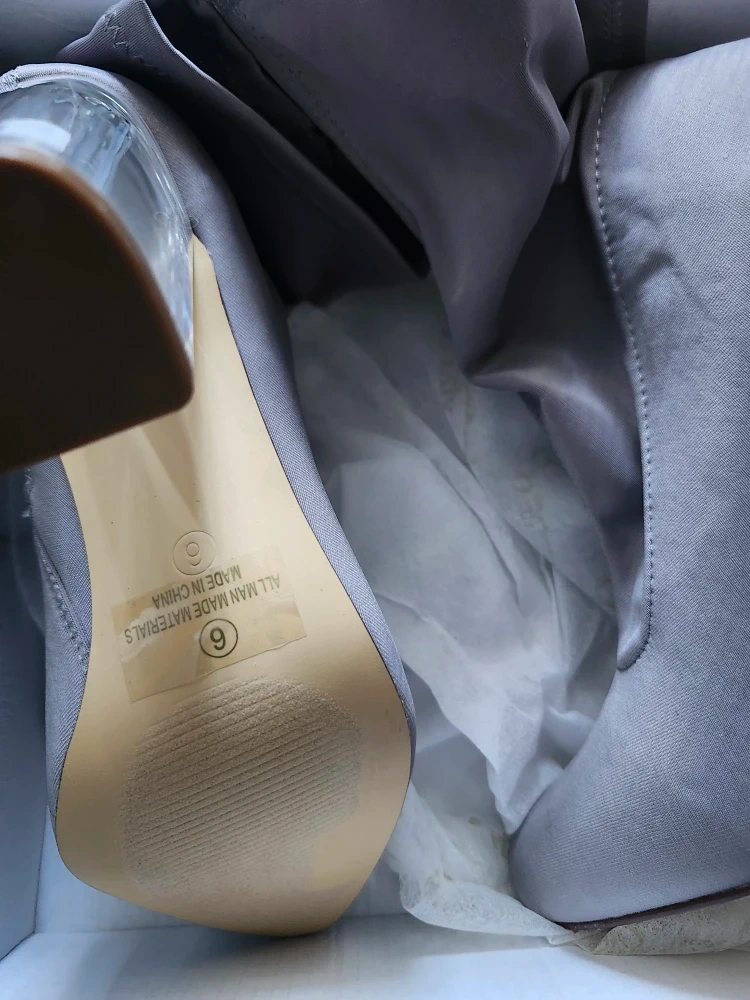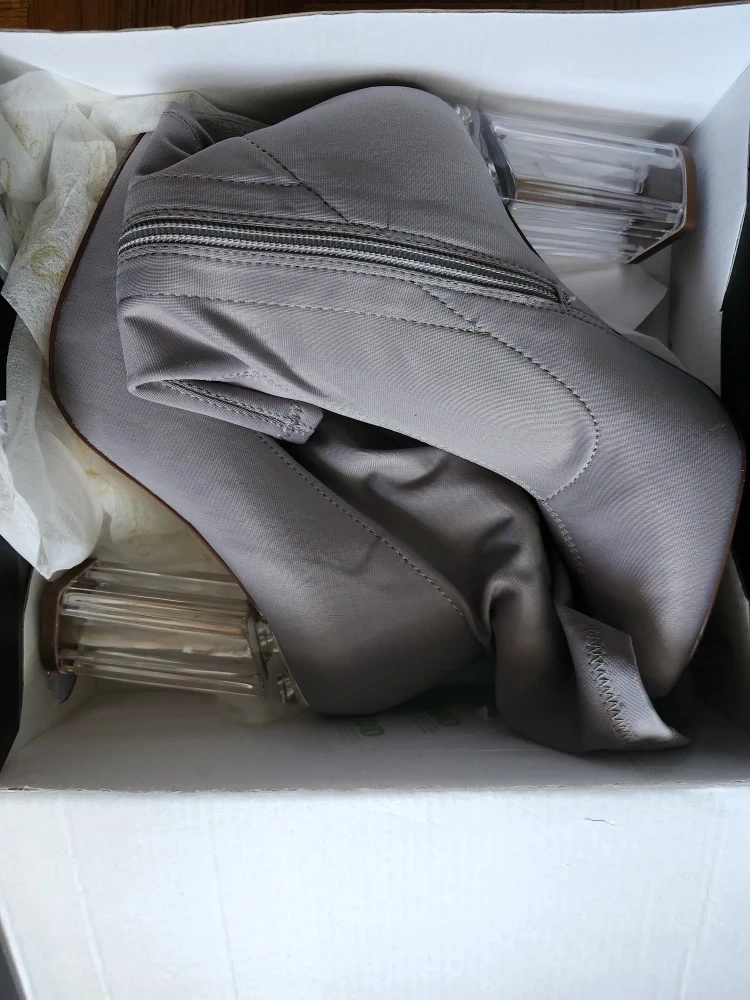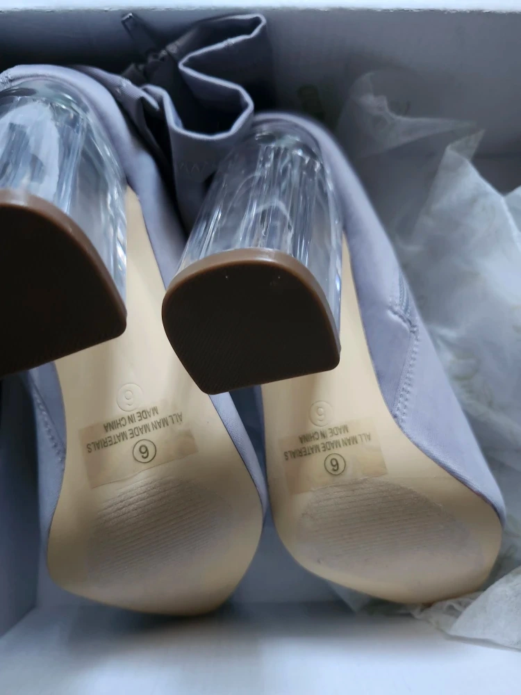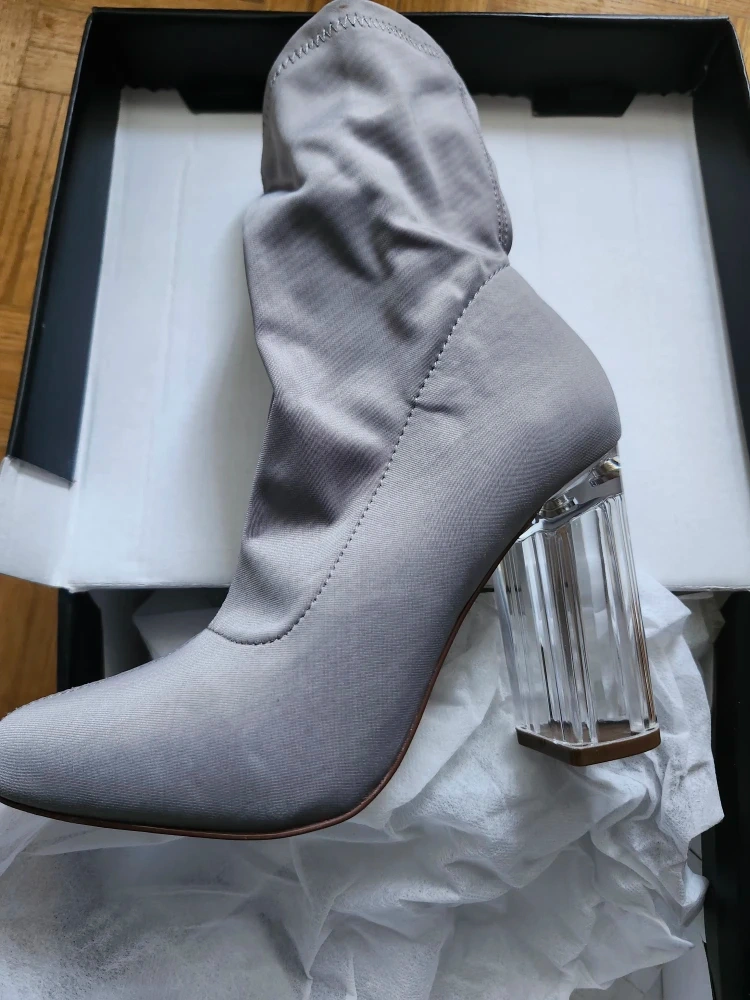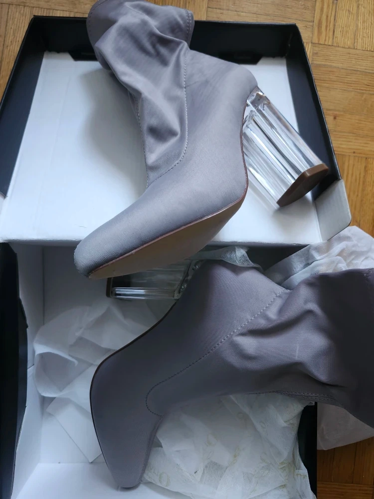 Here are some grey sock boots with clear block heels! They are brand new, a size 6, and come in the original box. Perfect for adding a little something extra to your outfit!