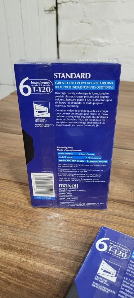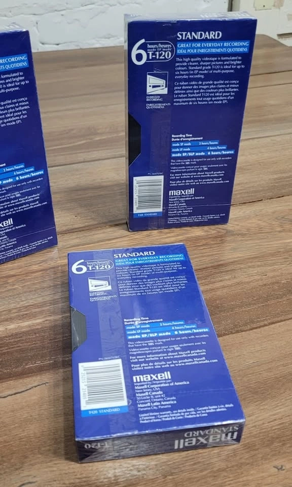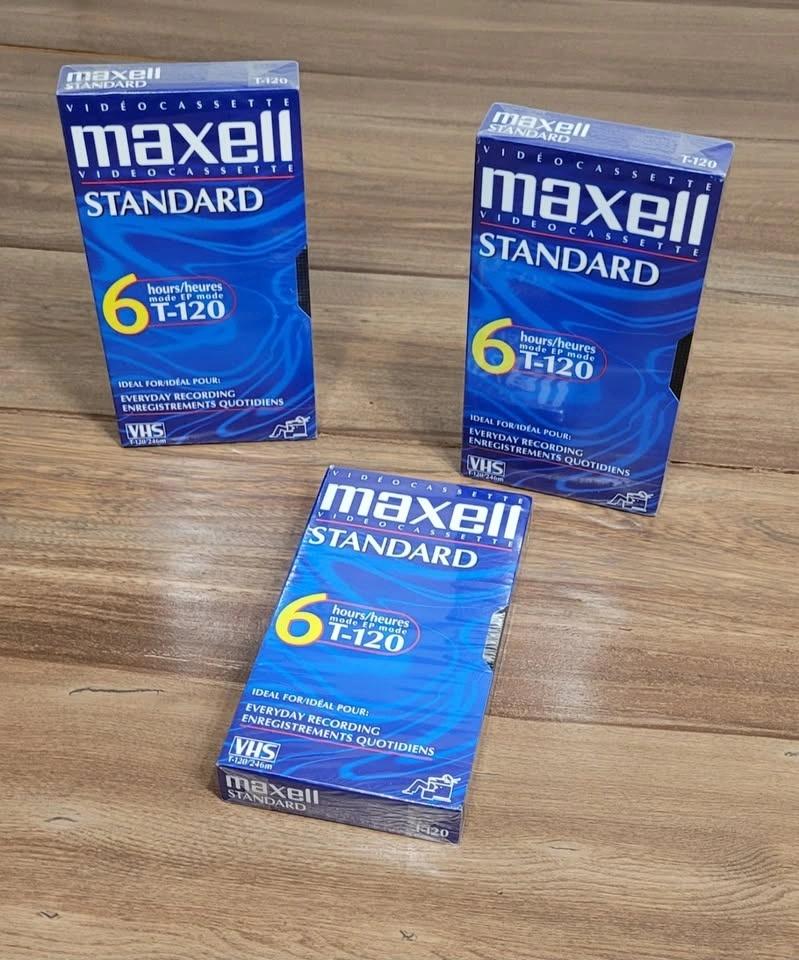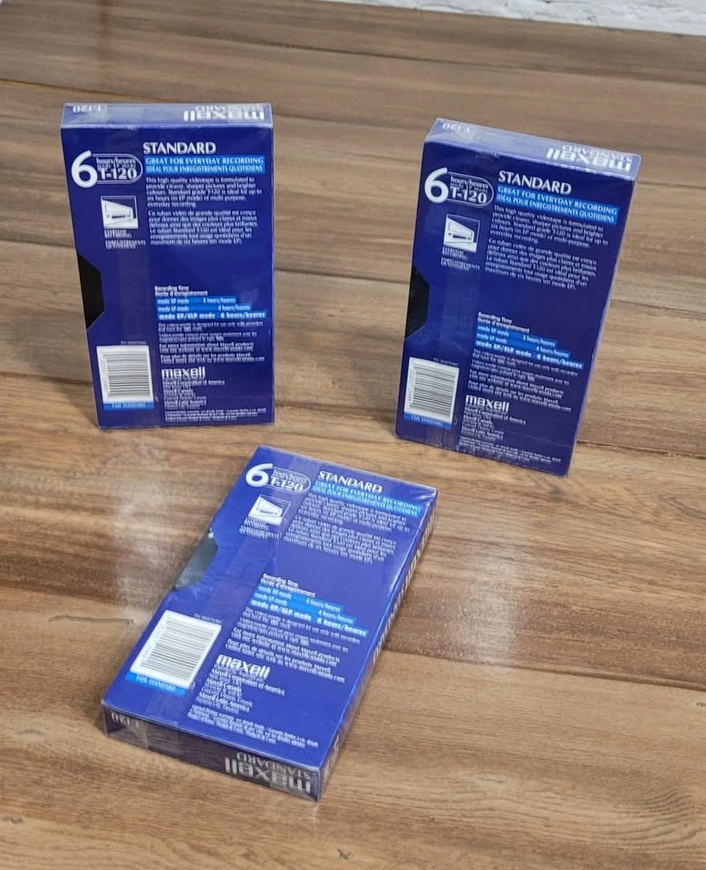 3 MAXELL Video Cassette Standard 6 hour T-120 VHS Tapes. Brand New, Un-Opened Sealed in their Original Packaging. $20 each. Ideal for every day recording.
