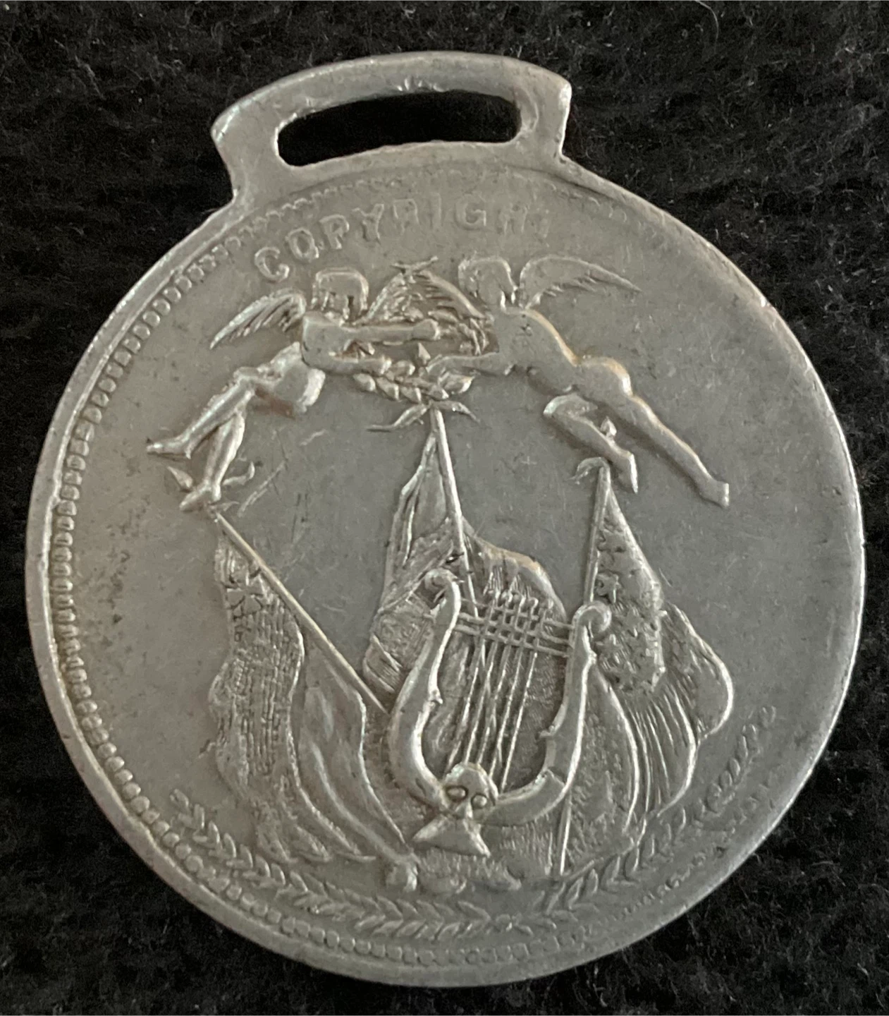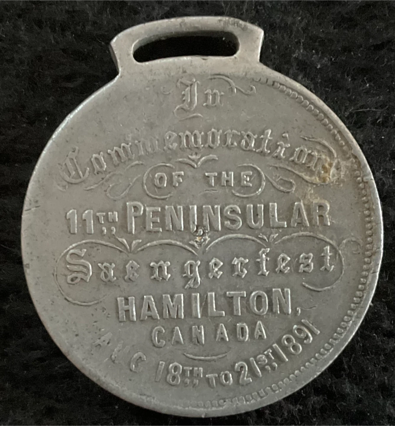 Selling a commemorative medal from the 11th Peninsular Saengerfest held in Hamilton, Canada, in 1891. It features a detailed design with angels, flags, and a harp on one side, and commemorative text on the other. A unique piece of history!
