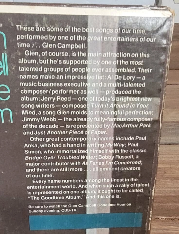 On the record albums back cover it advertises the Glen Campbell Goodtime Hour on Sunday evening on CBS-TV (see photos).