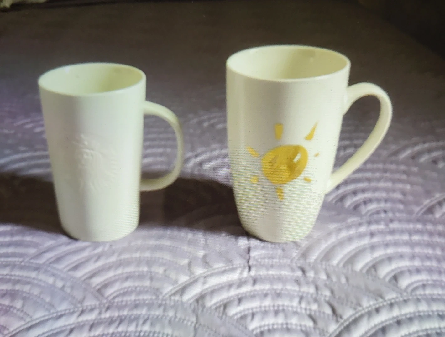 Selling a set of two mugs! One is a Starbucks mug with the logo embossed on the side, and the other has a cute sunshine design. Both are in great condition and ready for your morning coffee or tea