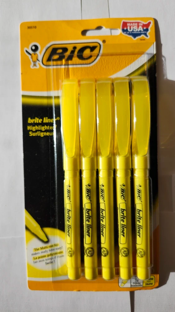 Here's a pack of 5 BIC Brite Liner highlighters in yellow. These highlighters feature super bright fluorescent inks and a chisel tip that allows for broad and fine lines. Perfect for highlighting and underlining!