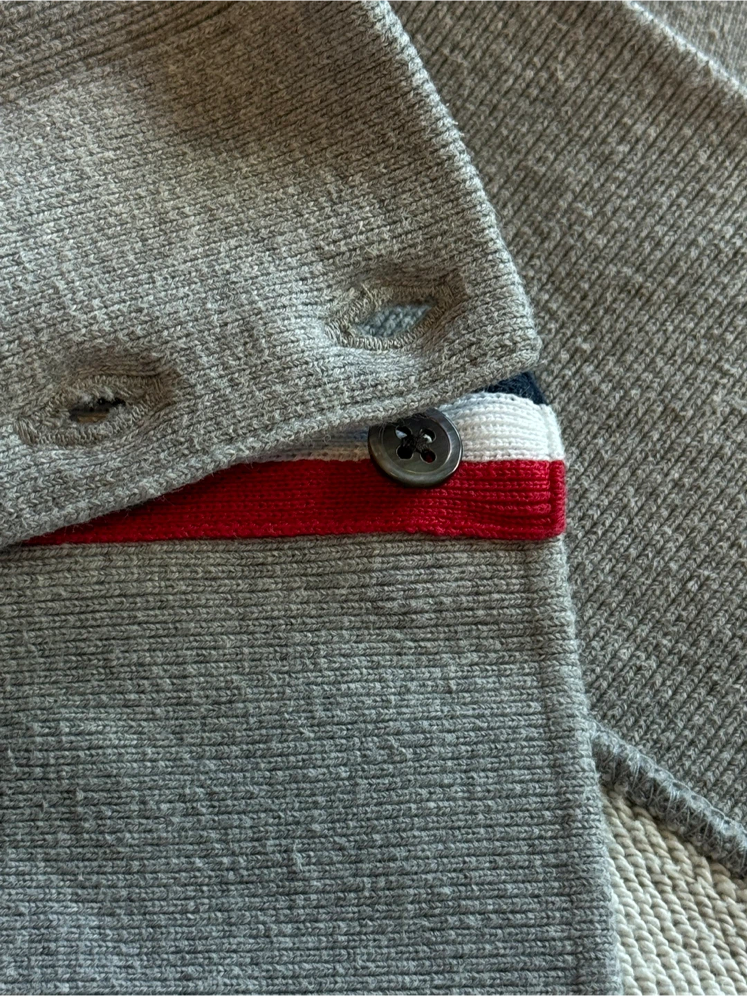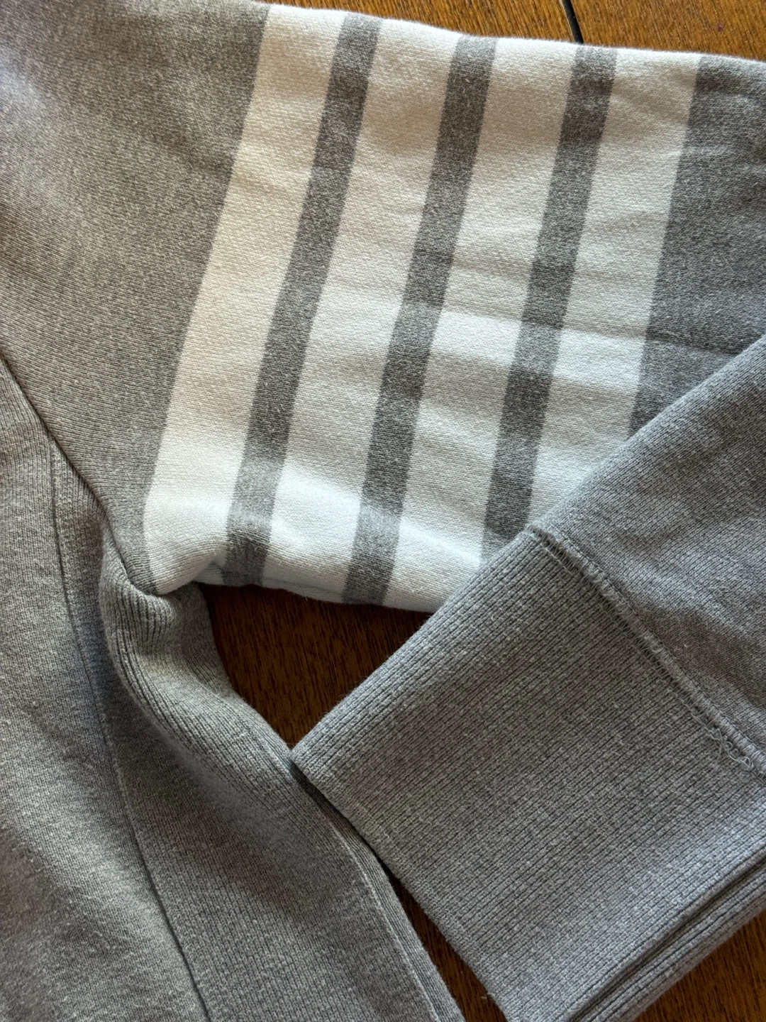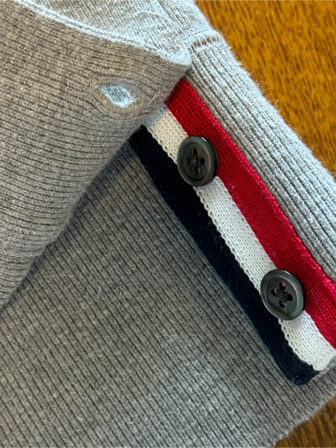 Selling a Thom Browne grey sweatshirt. It's a size 3. Features the signature Thom Browne stripes on the sleeve and the red, white, and blue detailing at the cuff. A stylish and comfortable piece.