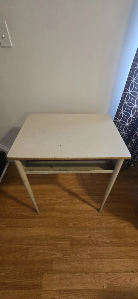 Selling a vintage white desk. It has a simple, classic design with a small shelf underneath the tabletop. It's perfect for a small space or as a project piece!