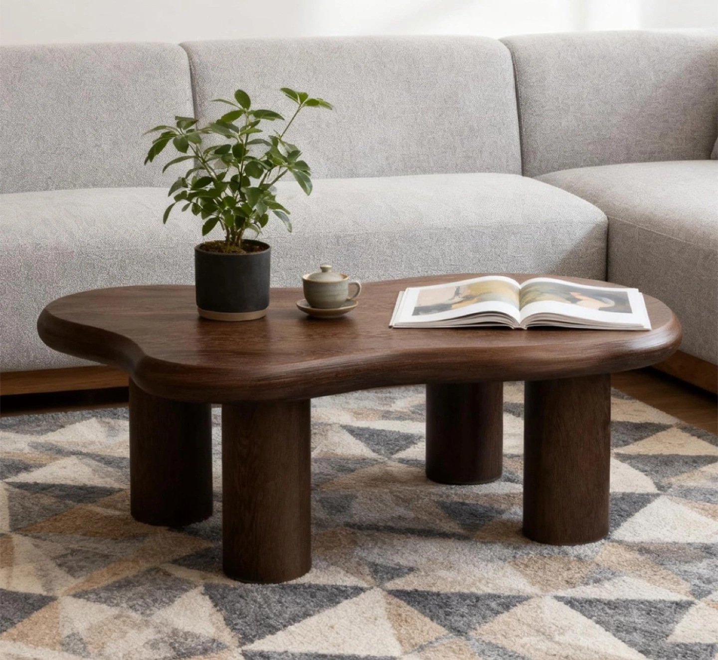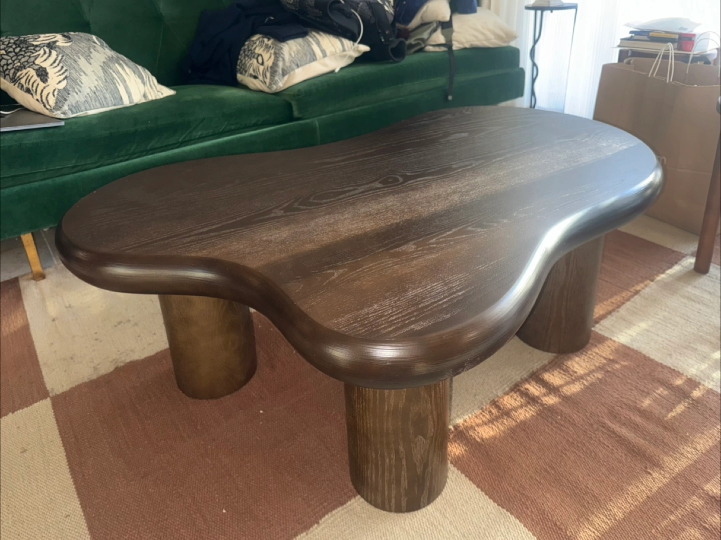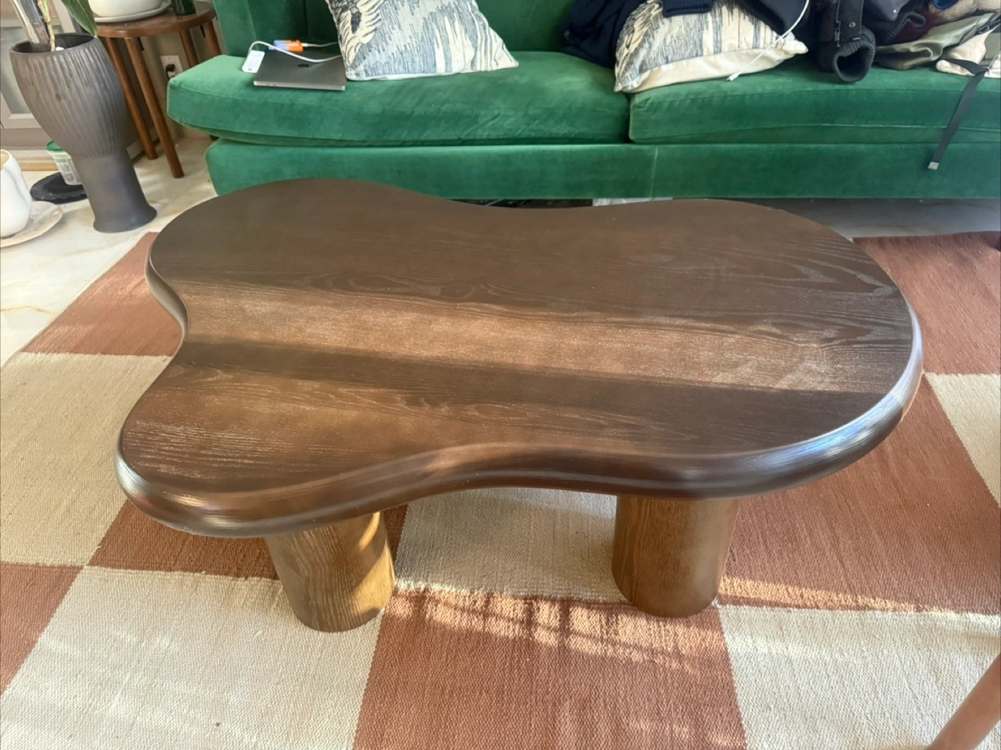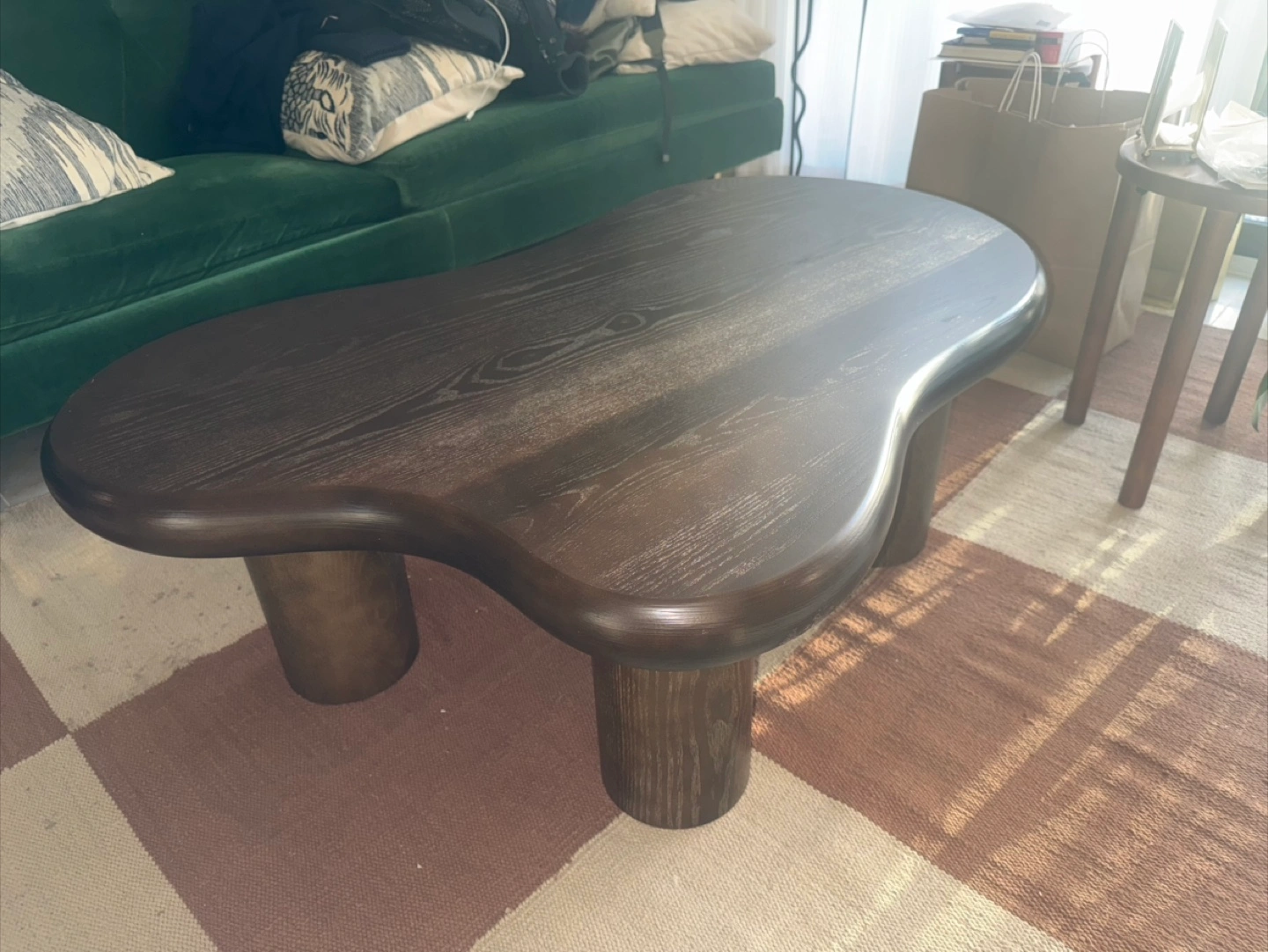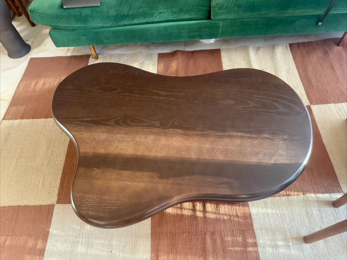 Modern coffee table with a cloud shape design, perfect for adding a unique touch to your living room! The table has four legs and a beautiful brown finish. It measures 46 x 31 x 15 inches.