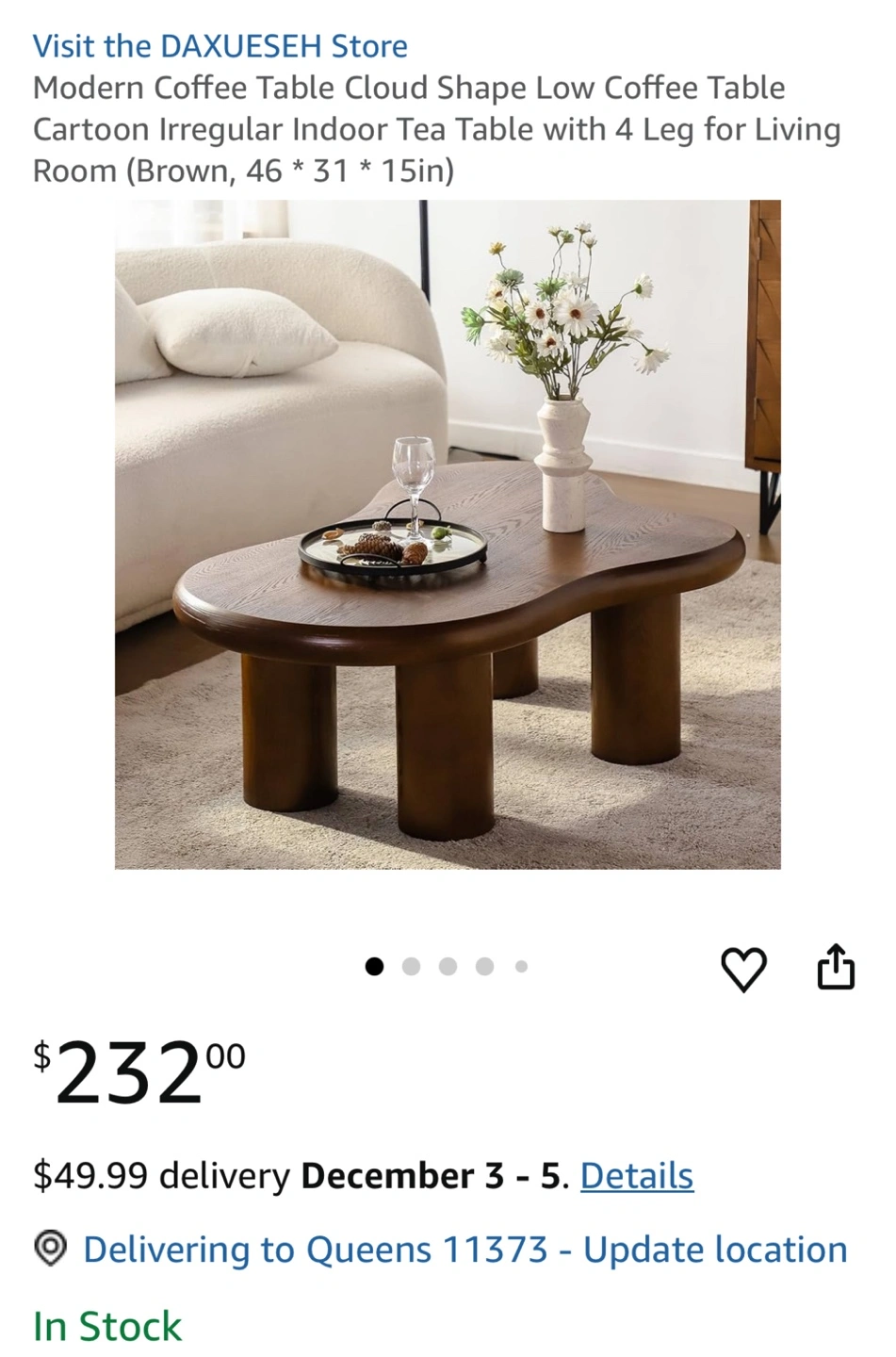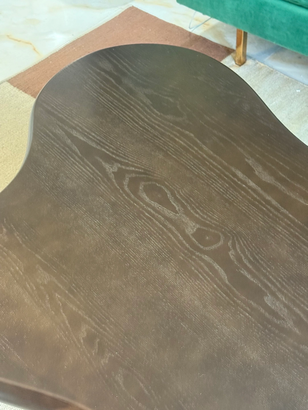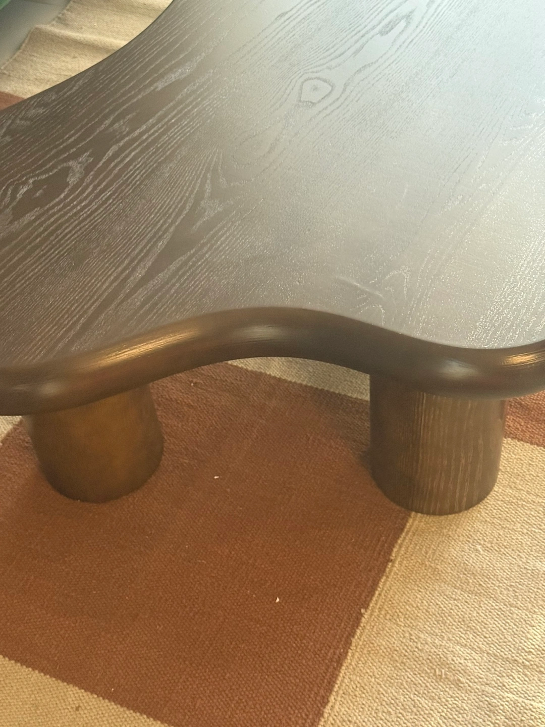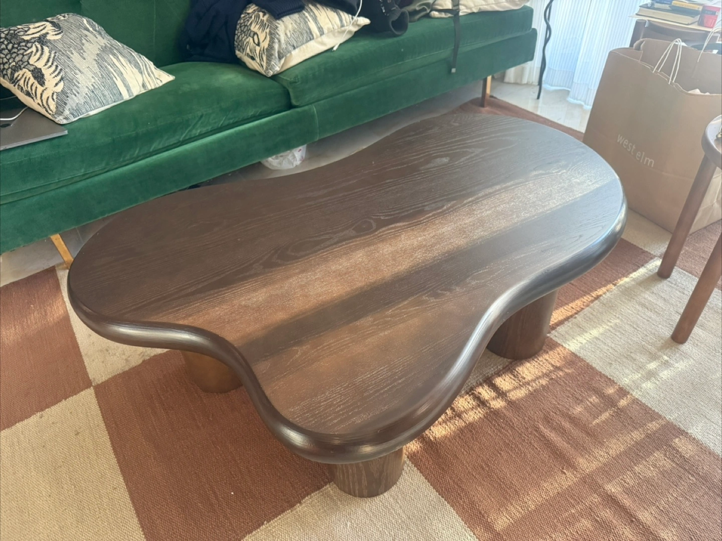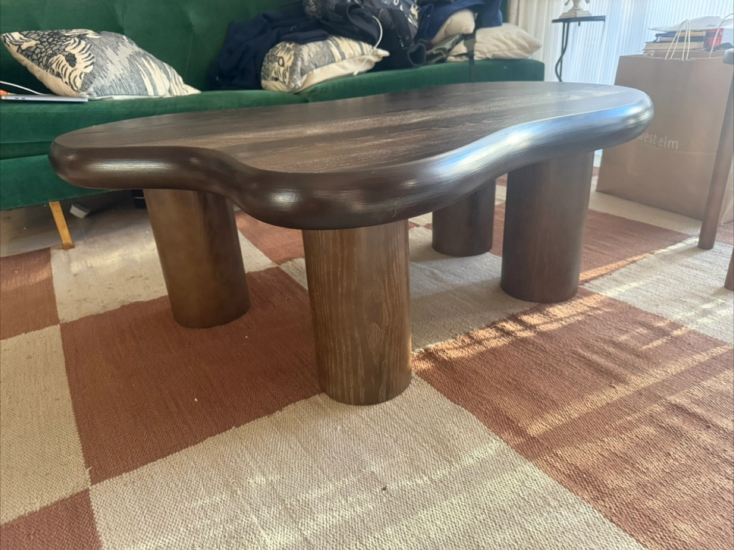 Modern coffee table with a cloud shape design, perfect for adding a unique touch to your living room! The table has four legs and a beautiful brown finish. It measures 46 x 31 x 15 inches.