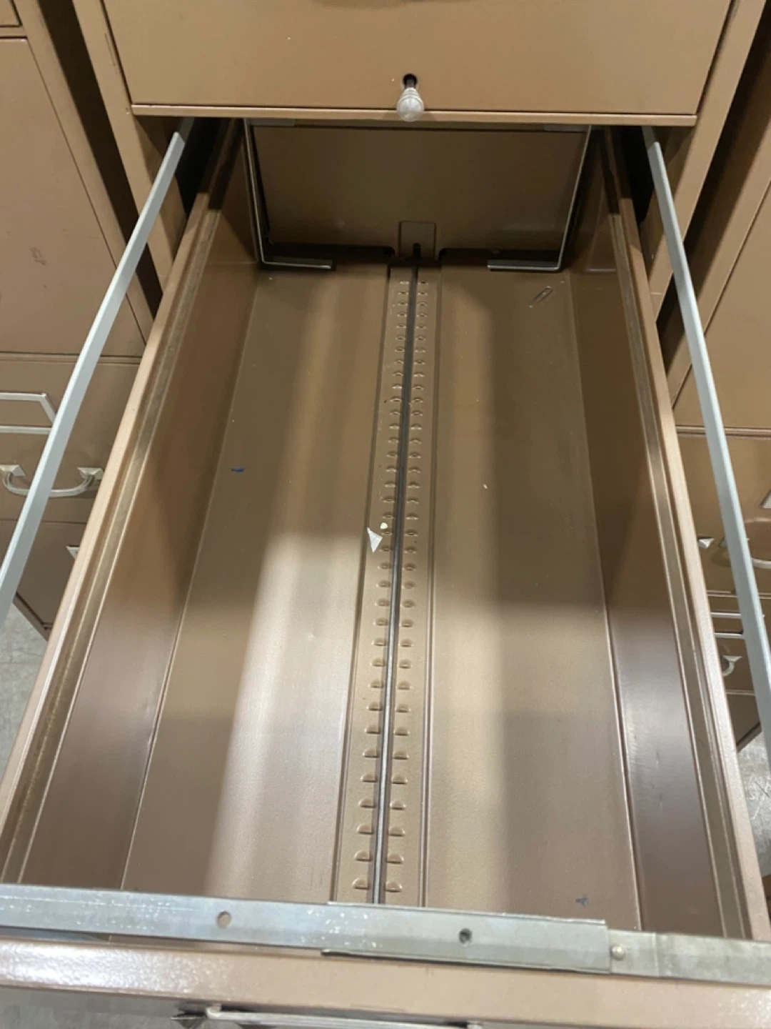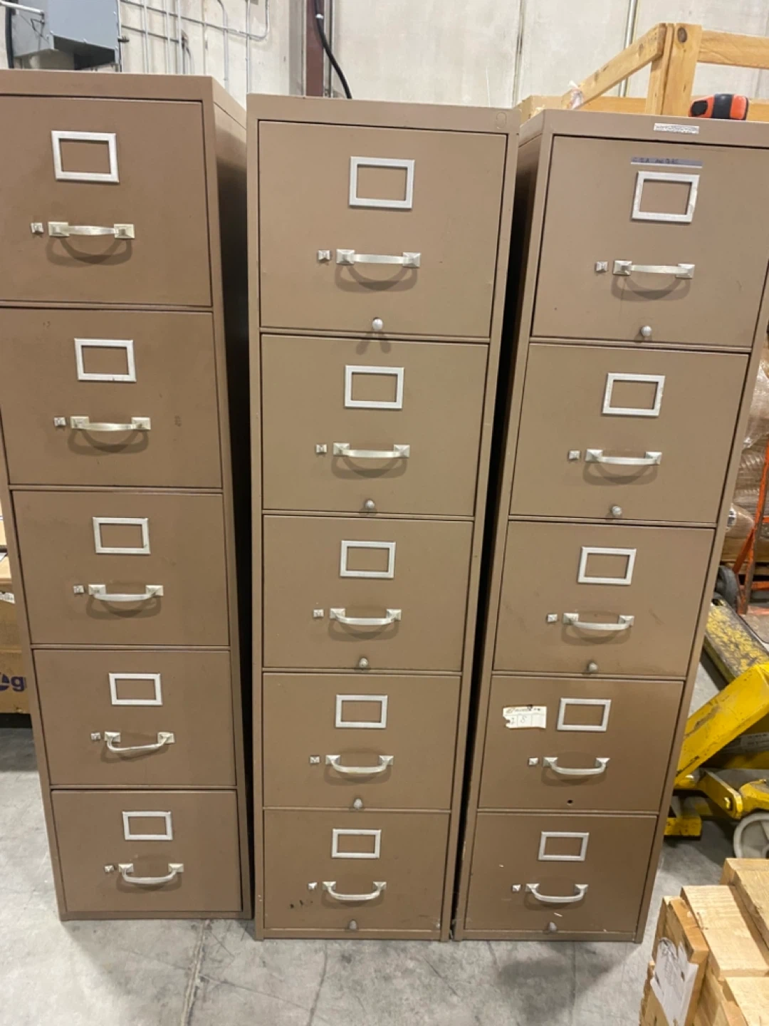 Selling 5 Royal Metal filing cabinets in good condition. It's a five-drawer cabinet, perfect for organizing your documents. The cabinet is brown and measures approximately 15 inches wide and 59 inches tall.