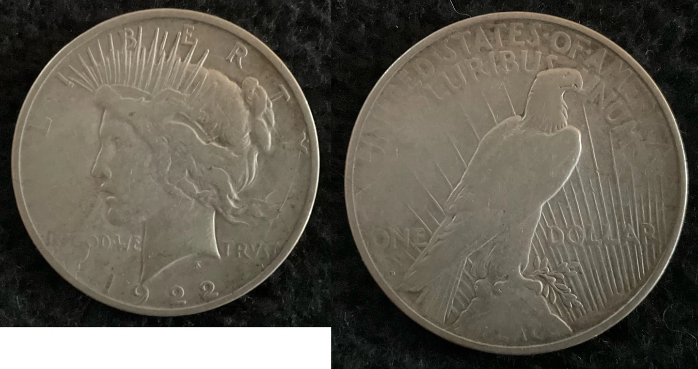 Selling a 1922 Peace Silver Dollar. It has a classic design featuring Lady Liberty on one side and an eagle on the other. The 90% silver content alone makes this a valuable coin.