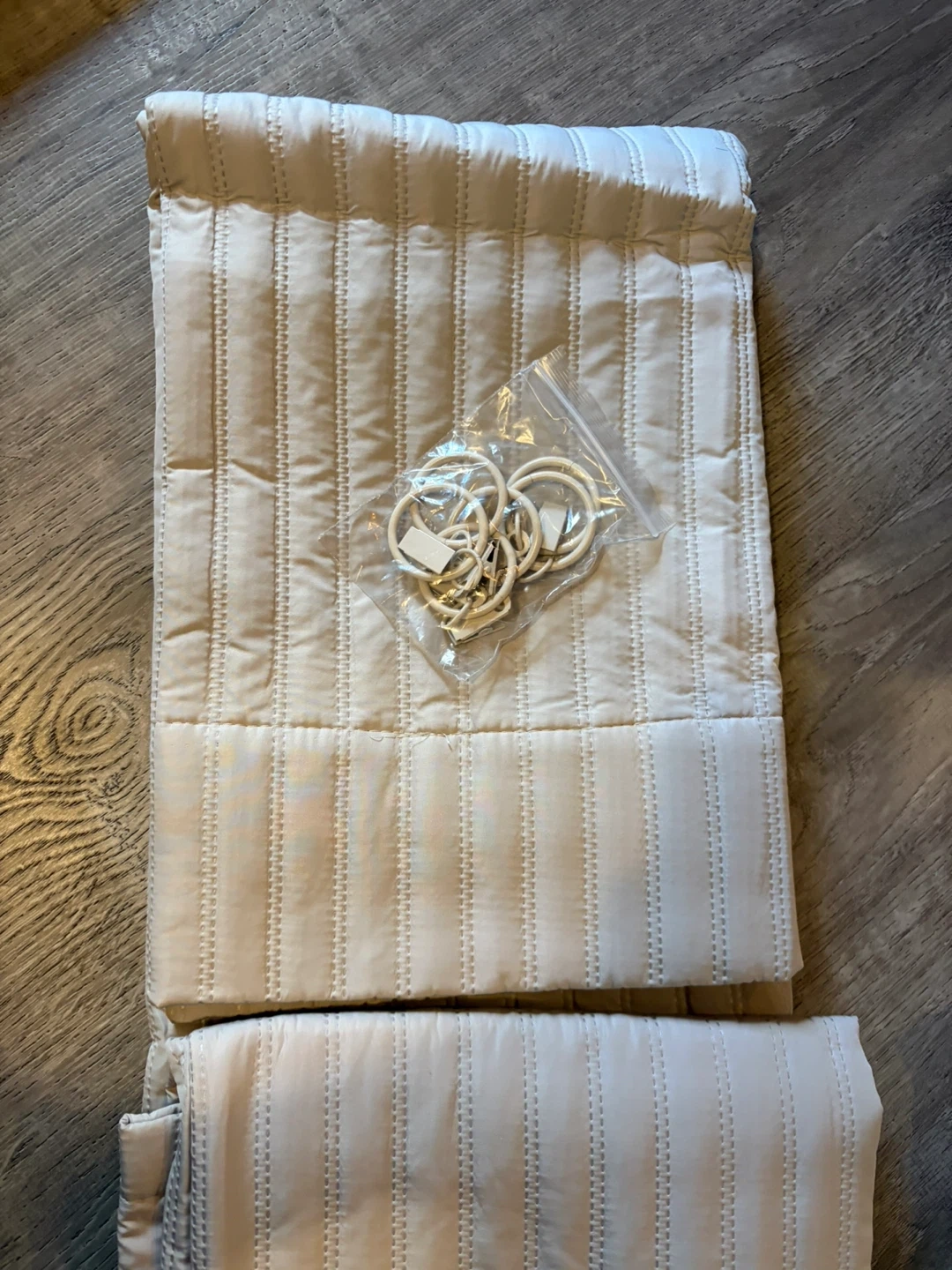 Selling two panels of curtains in a lovely beige color! They are quilted and come with clips. Perfect for adding a touch of warmth and style to any room!