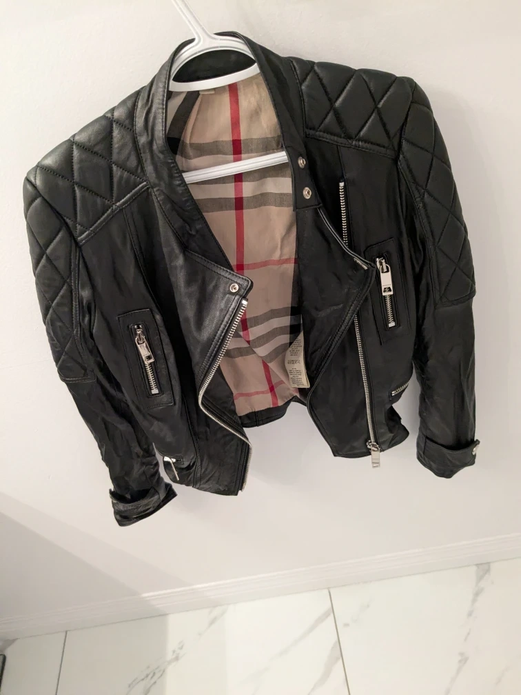 Here's a stylish Burberry black leather biker jacket. It has a quilted design on the shoulders and sleeves. The lining is the classic Burberry plaid. The main material is 100% lambskin.