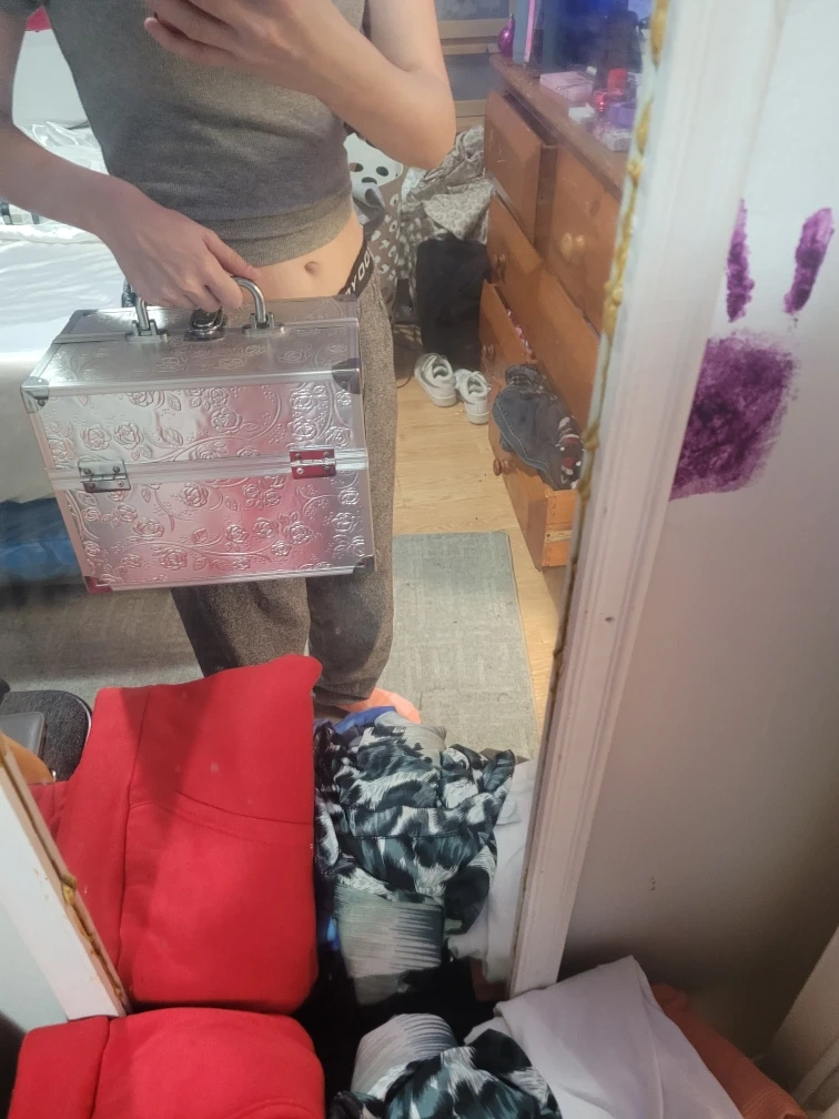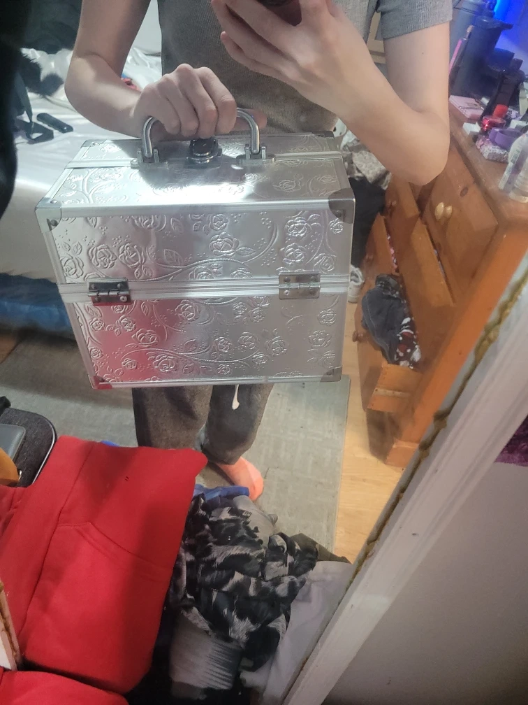 Selling a silver makeup/cosmetic case with a lovely floral pattern. It's in good condition and has multiple compartments to keep all your beauty products organized. Perfect for travel or keeping your vanity tidy!