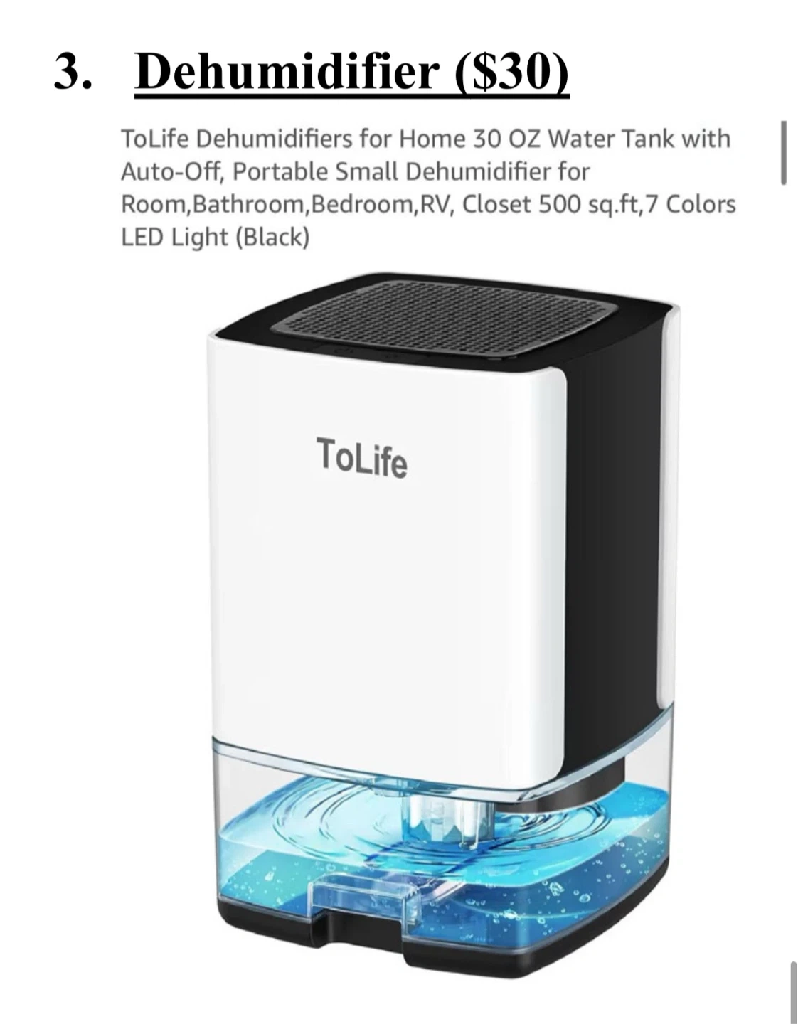 Selling a ToLife dehumidifier perfect for small spaces like a room, bathroom, bedroom, RV, or closet. It has a 30 OZ water tank with auto-off function. It's a portable small dehumidifier with 7 Colors LED Light.
