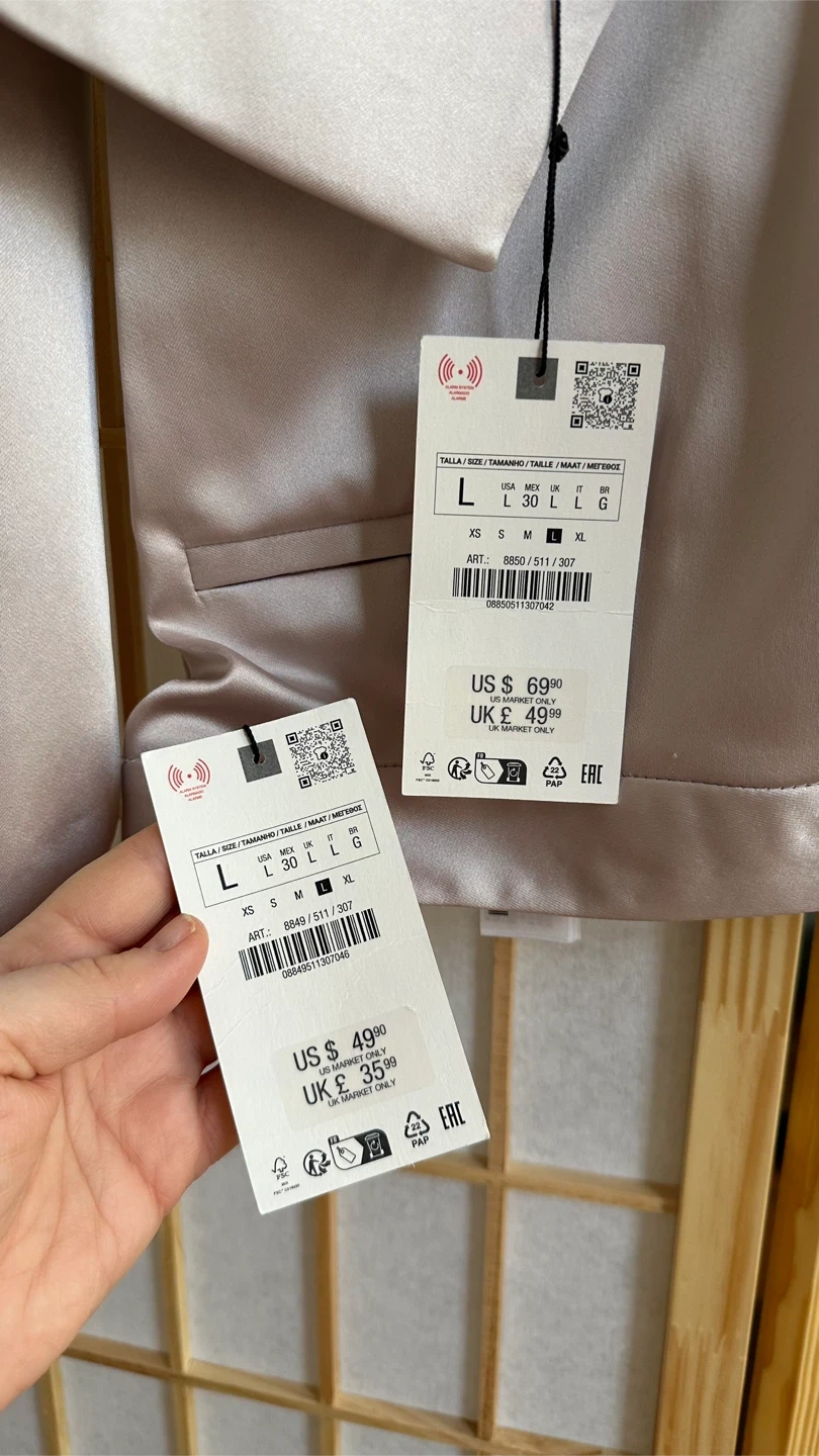 It's a size large, with tags still attached! The original price was $69.90 for the blazer and $49.90 for the pants.
