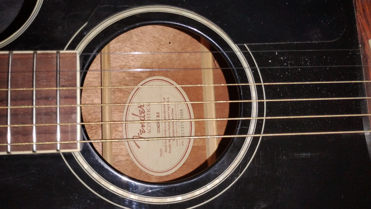 This is a Fender CD-140SCE BLK acoustic guitar. It features a cutaway body for easier access to higher frets. Six steel strings are included. It's a great instrument for learning or playing.