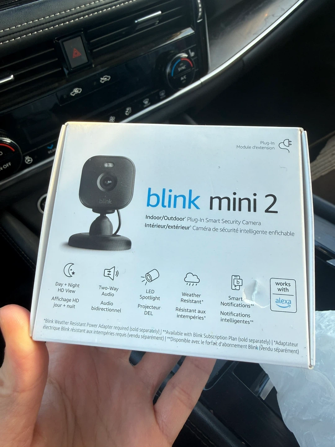 This is the Blink Mini 2 smart security camera. It offers HD Day + Night view and two-way audio. It also has an LED spotlight and is weather resistant. Smart notifications are included, and it works with Alexa!