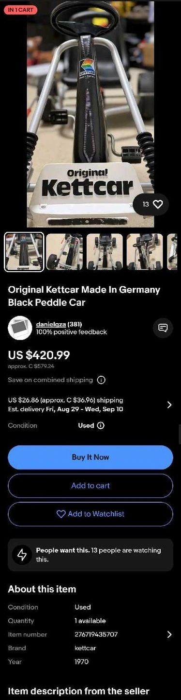 Selling a Kettcar pedal car in yellow and black. It's in used condition. Very rare. Open to offers. These are worth lots of money restored. There's one on ebay asking $580.