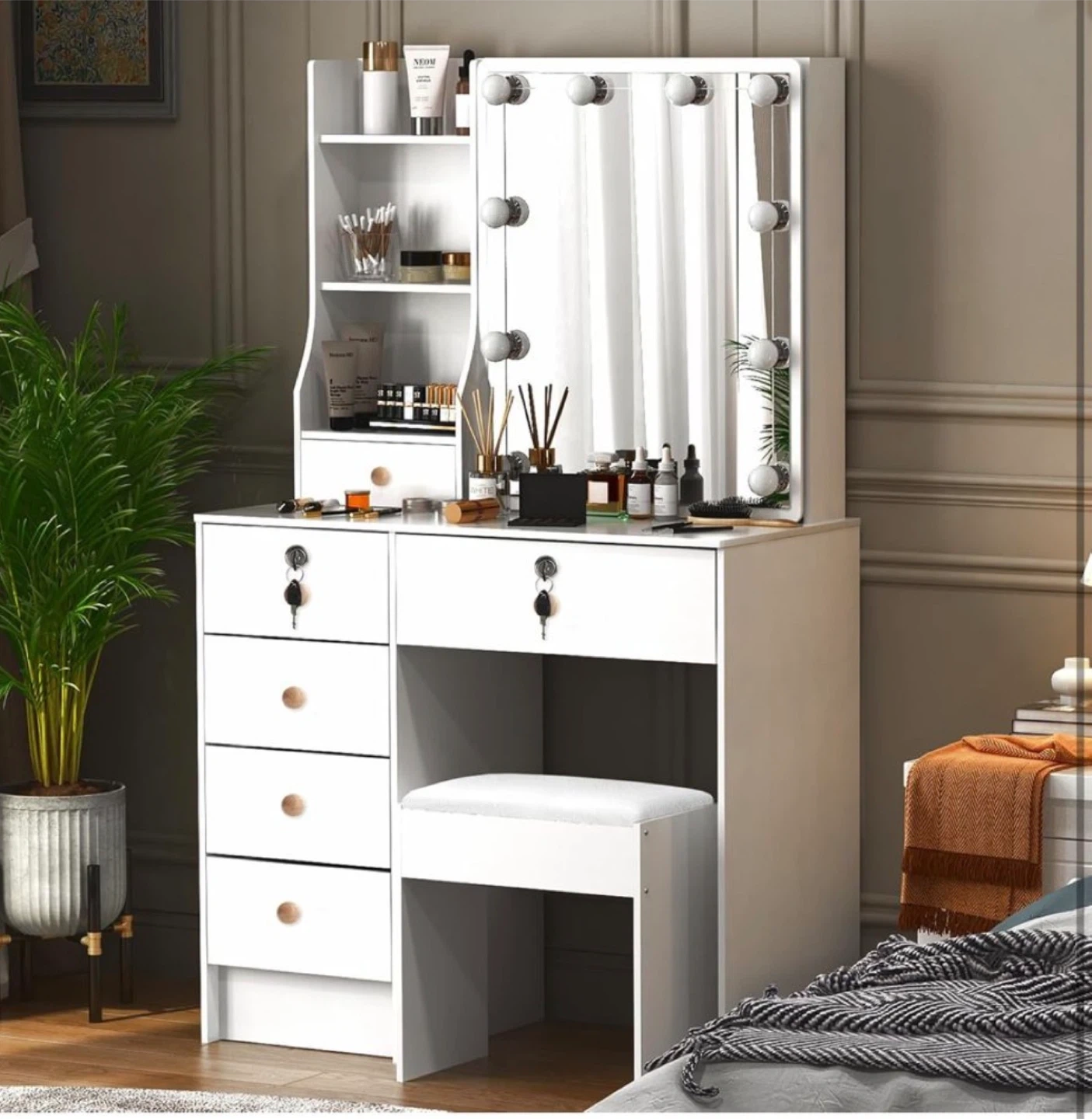 Selling a stylish white vanity table. It's perfect for getting ready and adding a touch of elegance to your space. It features drawers and shelves for all your makeup and accessories.